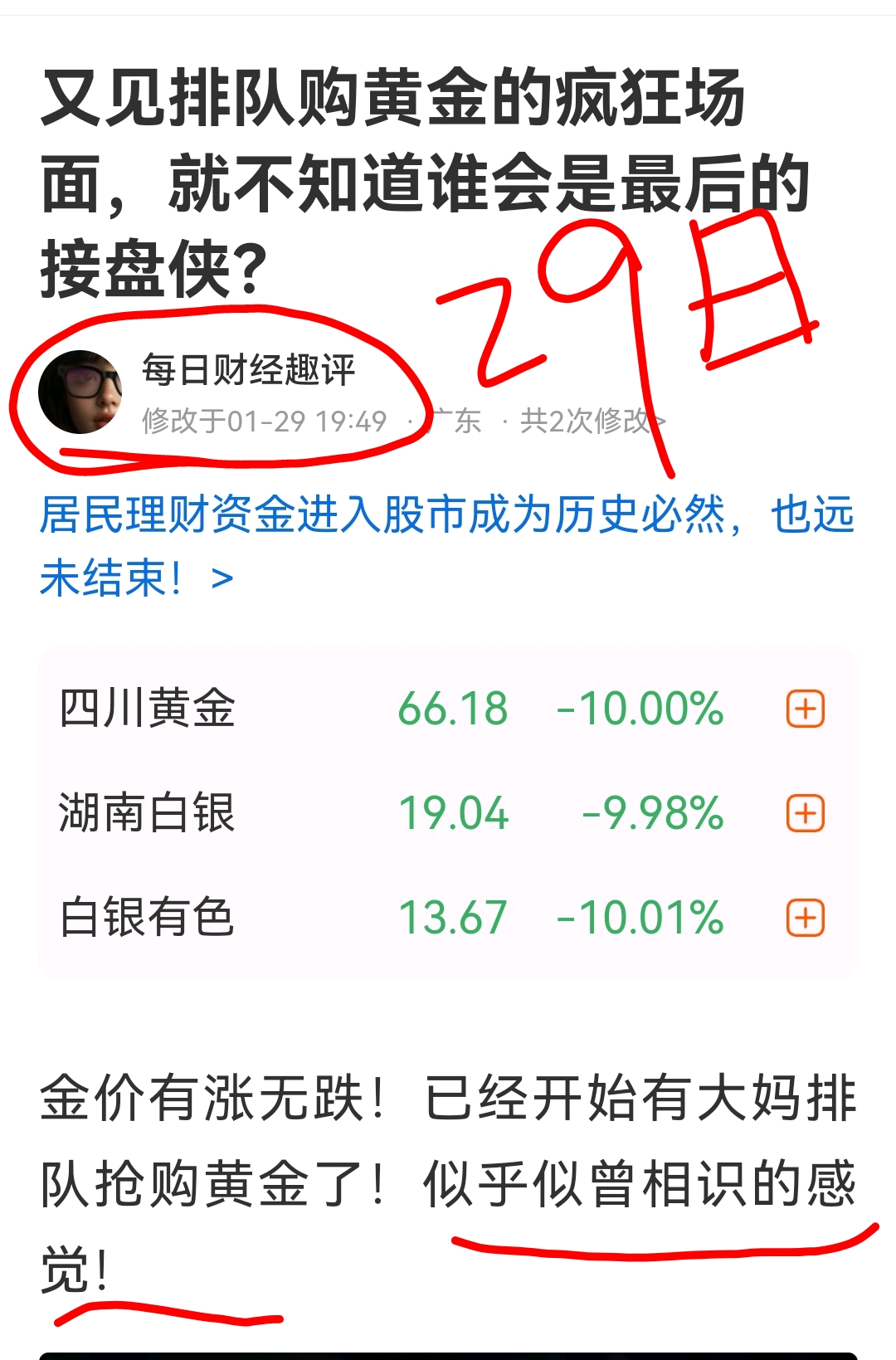 对此大家怎么看?欢迎大家留言交流,谈谈大爷大妈排队买黄金的报道!#社区牛人计划# $湖南白银(SZ002716)$ $白银有色(SH601212)$ $四川黄金(SZ001337)$