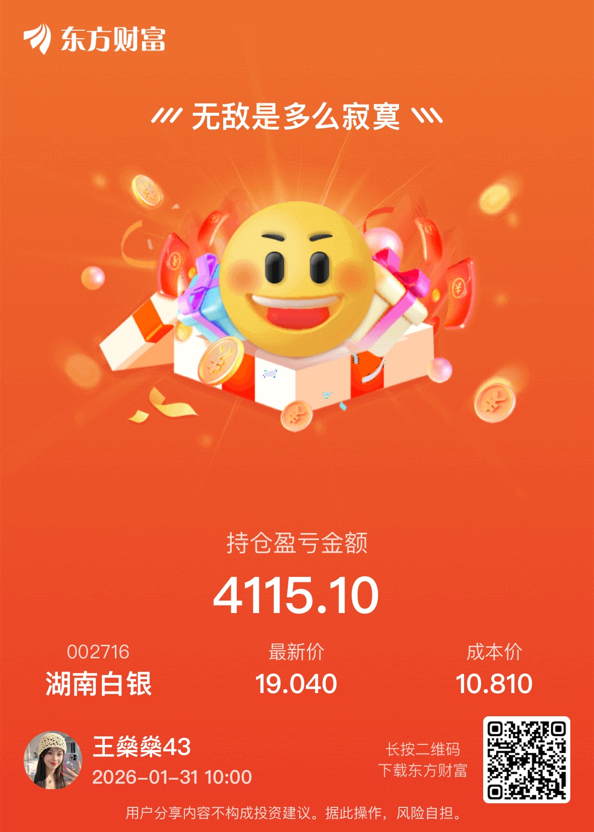 温馨提示: 1.根据《证券法》规定,禁止编造、传播虚假信息或者误导性信息,扰乱证券市场;2.用户在本社区发表的所有资料、言论等仅代表个人观点,与本网站立场无关,不对您构成任何投资建议。用户应基于自己的独立判断,自行决定证券投资并承担相应风险。《东方财富社区管理规定》