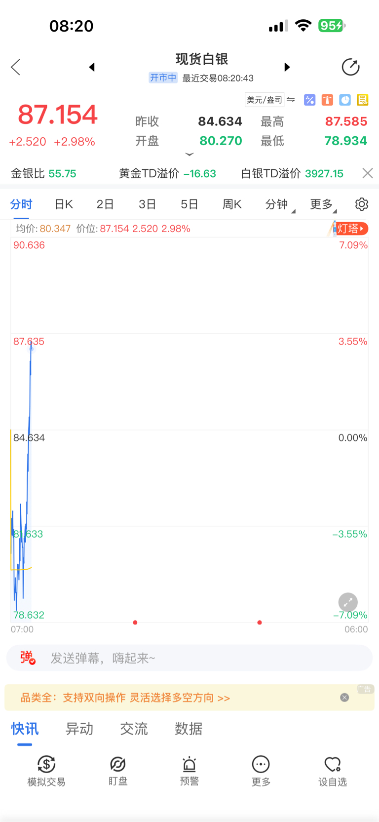 好消息,好消息,白银开盘跌7个点,现在反超。