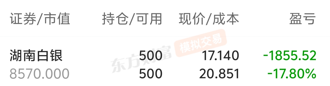 $湖南白银(SZ002716)$ 模拟盘和实盘同步,实盘是模拟盘60倍资金,不敢打开实盘账户看了,都怪自己上头了,前几天被铺天盖地的消息蒙了心,说贵金属和有色会出十倍股,唉!这个年过不下去了,本来在别的板块出来就已经亏了不少还没有回本,现在又被杀一波快腰斩了。