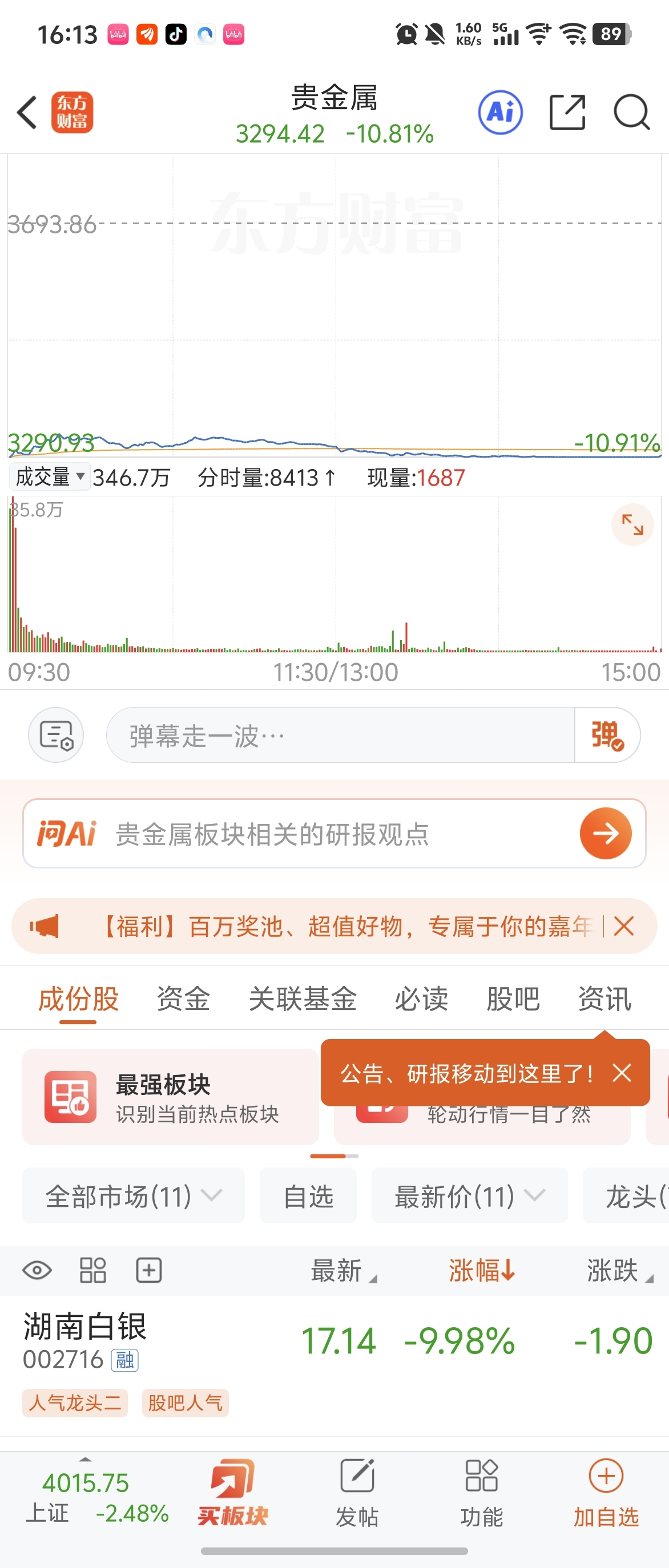 $湖南白银(SZ002716)$ 贵金属板块涨幅第一的票,关注了,明天看反弹。
