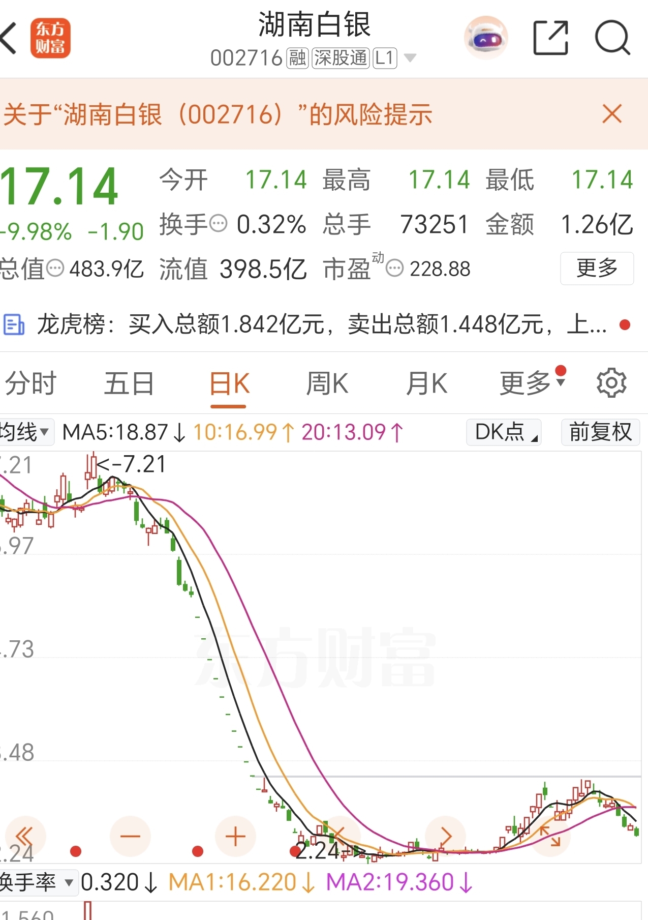 $湖南白银(SZ002716)$ 这个股的股性很不好,逮着机会就瞎跌停的,19年我在上面栽过大跟头。