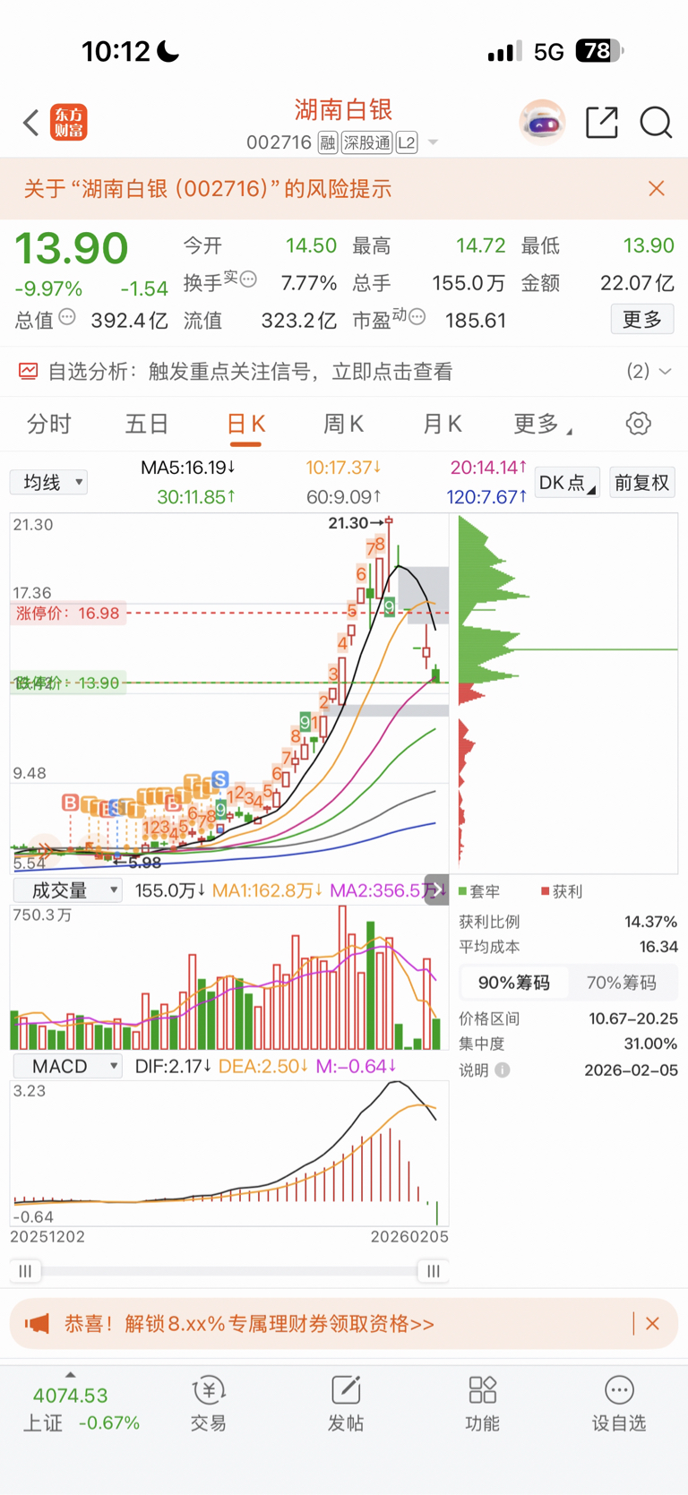 $湖南白银(SZ002716)$ 我两次卖飞的教训,让我知道了什么叫期货和股票之间的差异,股票处于出货阶段,现货白银越涨,散户越想抄底,越有利于股票出货……