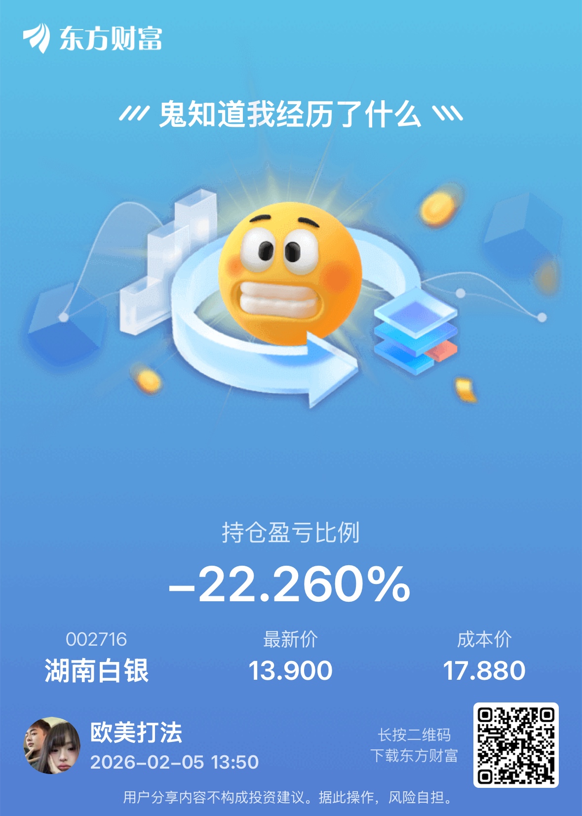 温馨提示: 1.根据《证券法》规定,禁止编造、传播虚假信息或者误导性信息,扰乱证券市场;2.用户在本社区发表的所有资料、言论等仅代表个人观点,与本网站立场无关,不对您构成任何投资建议。用户应基于自己的独立判断,自行决定证券投资并承担相应风险。《东方财富社区管理规定》