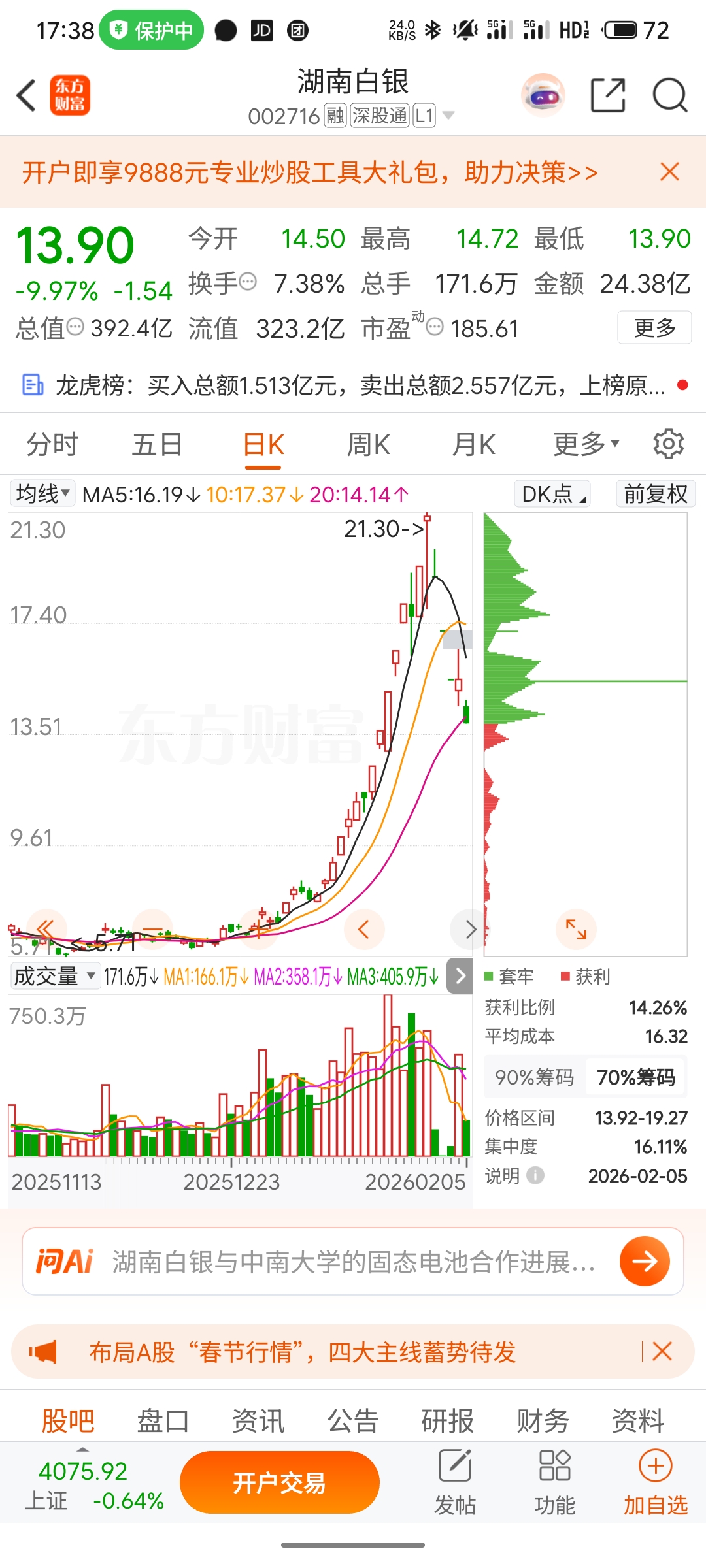 $湖南白银(SZ002716)$ 劝大家早点割了吧,86%的套牢盘,外加龙虎榜散户霸榜,主力早跑了,现在全是散户互相践踏,外加之前公司回购不超过8块,也给了强烈暗示了,就算黄金回5600,也救不了的,上面套牢盘太多了