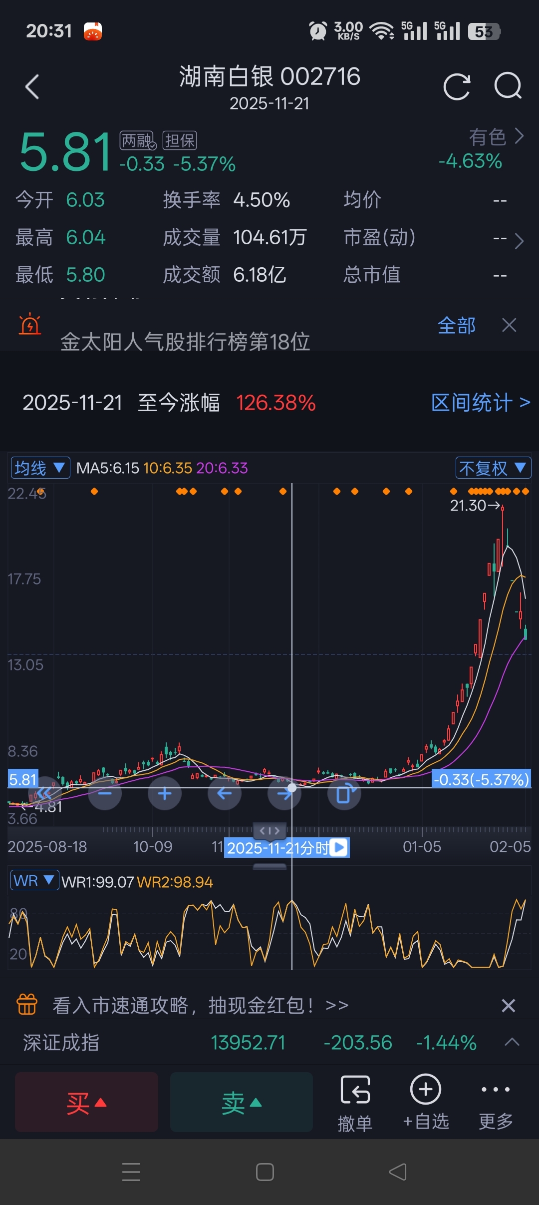 $湖南白银(SZ002716)$ 游资量化利用买涨不买跌的心里短期从6元炒到21元,涨了三倍多,而国际银价才涨一倍多,记住,股票只能买那种横盘几年至少几个月的股票,要抄底不要追涨,可怜,把这些操控股价的人抓起来吧