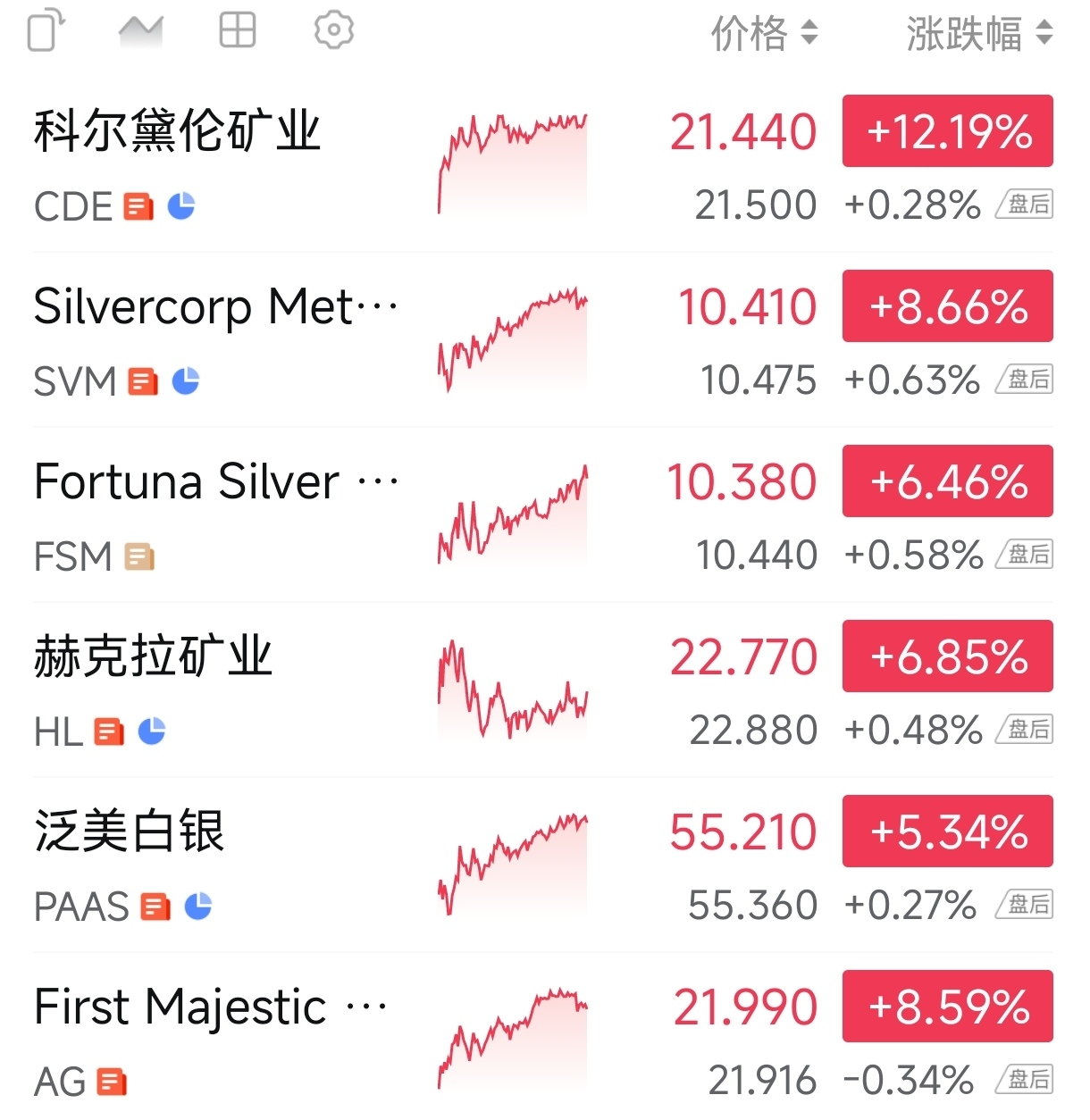 啥也不说了,看看美股白银股昨晚的涨幅。