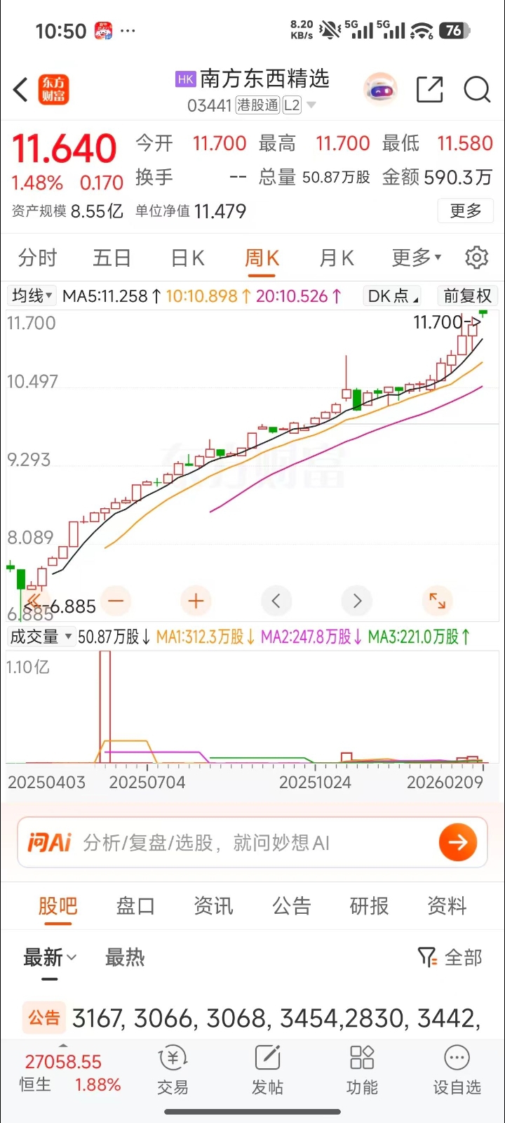 今天应该能涨停,但是我不羡慕,因为我在东西精选03441吃饱了,今天又创新高了