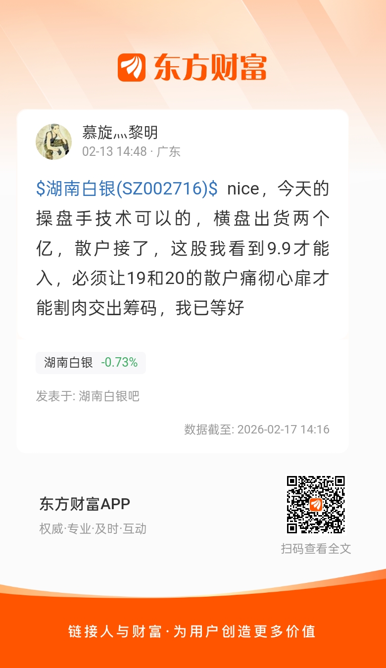 $湖南白银(SZ002716)$ nice,今天的操盘手技术可以的,横盘出货两个亿,散户接了,这股我看到9.9才能入,必须让19和20的散户痛彻心扉才能割肉交出筹码,我已等好