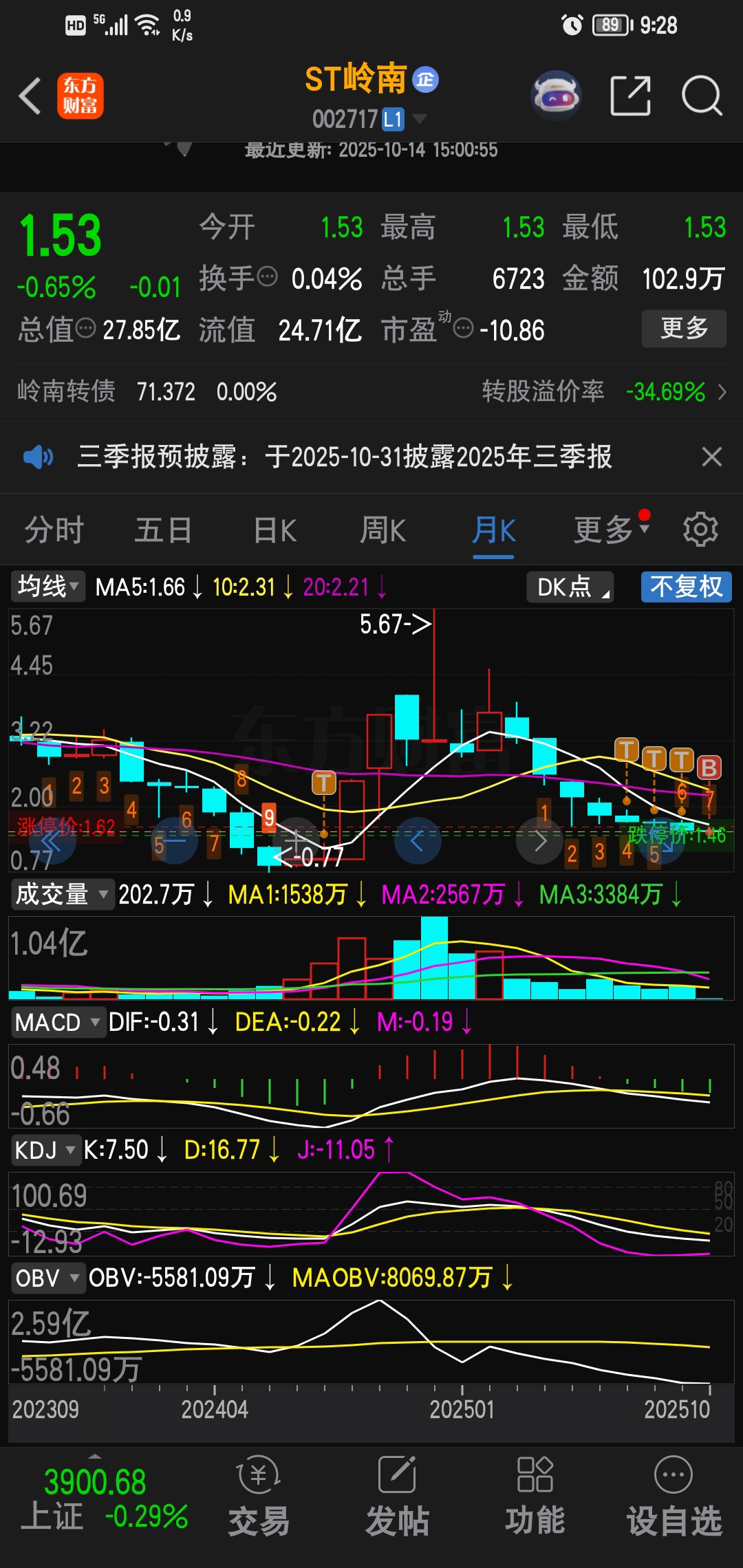 $ST岭南(SZ002717)$ 月K8走阴跌80多个点,怎么一个反弹也没?