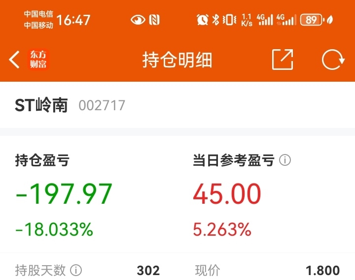 $ST岭南(SZ002717)$ 不错,今天又赚了45元。