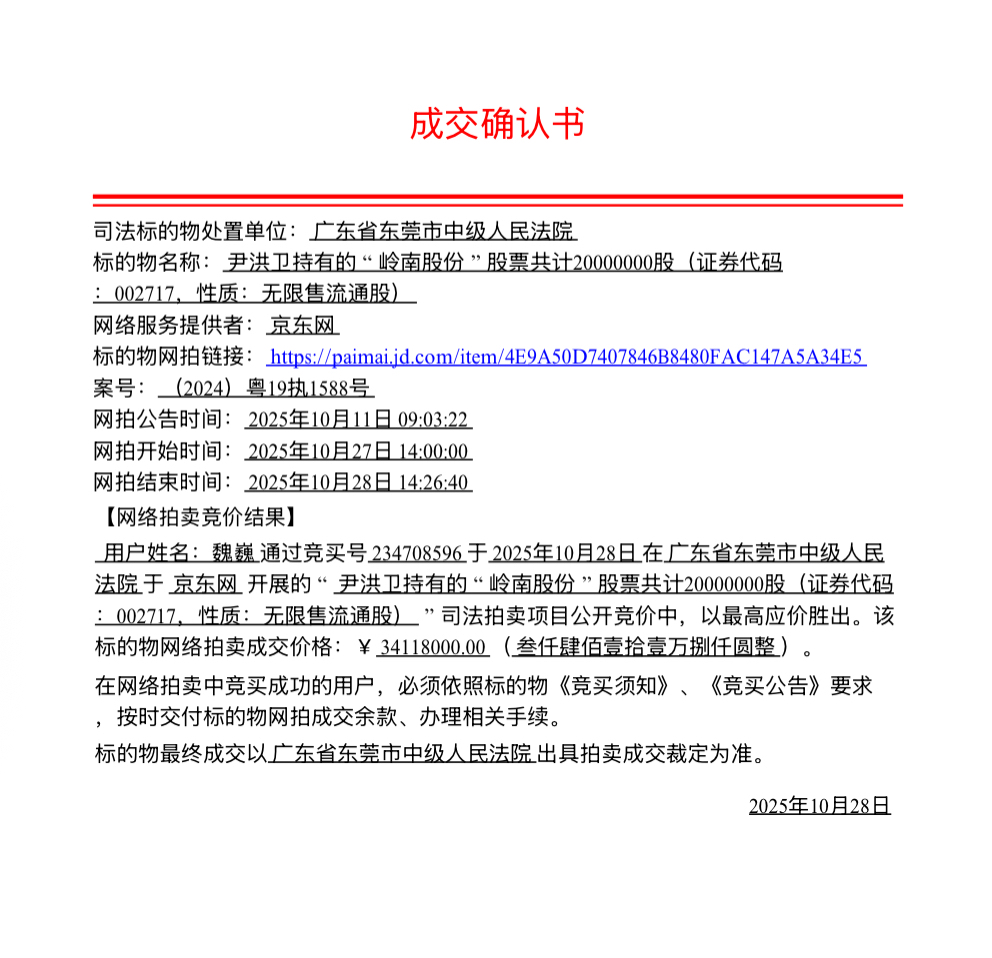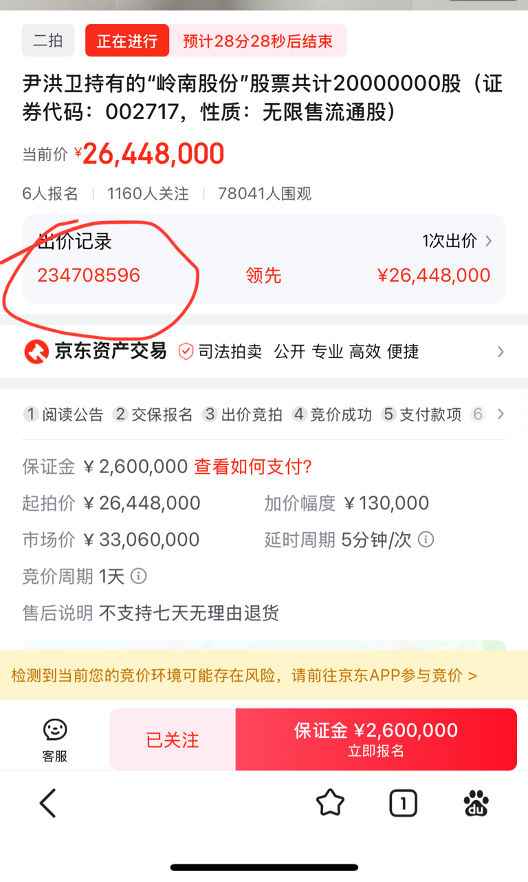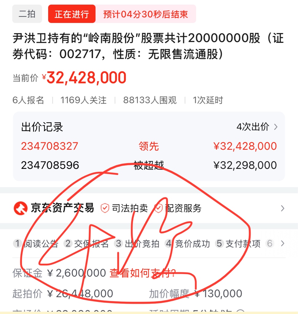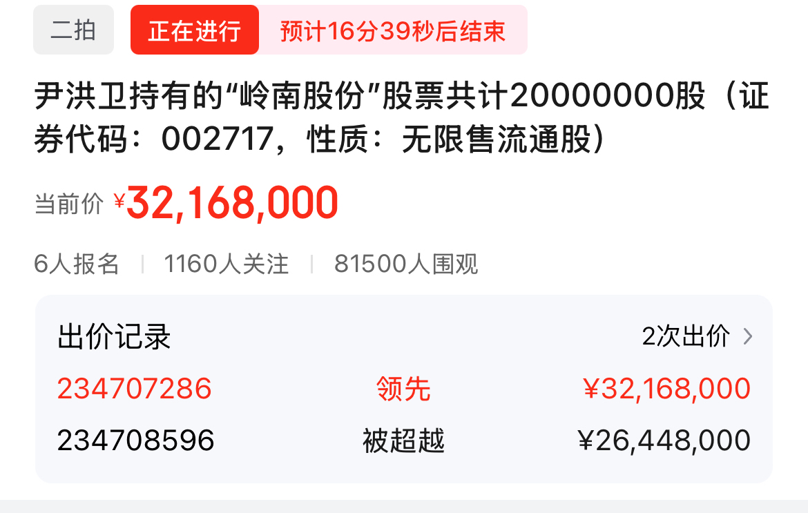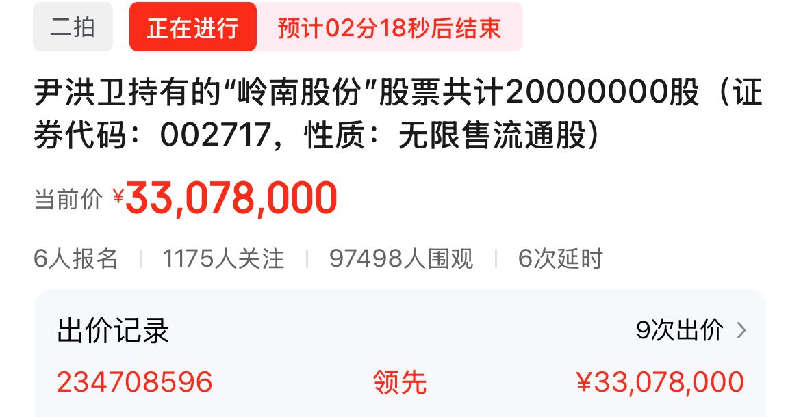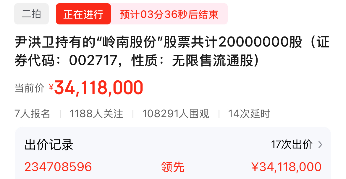 $ST岭南(SZ002717)$ $*ST正平(SH603843)$ $ST中迪(SZ000609)$ 尹洪卫持有的“岭南股份”股票共计20000000股(证券代码:002717,性质:无限售流通股)二次拍卖,6人报名,1人出价。