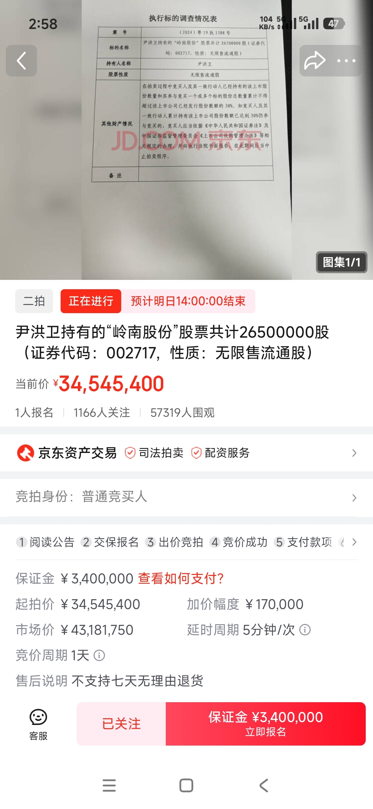 $ST岭南(SZ002717)$ 明天拍卖有人报名了,就剩下2个拍卖,今天跌停板不加仓的,明天拍断大腿