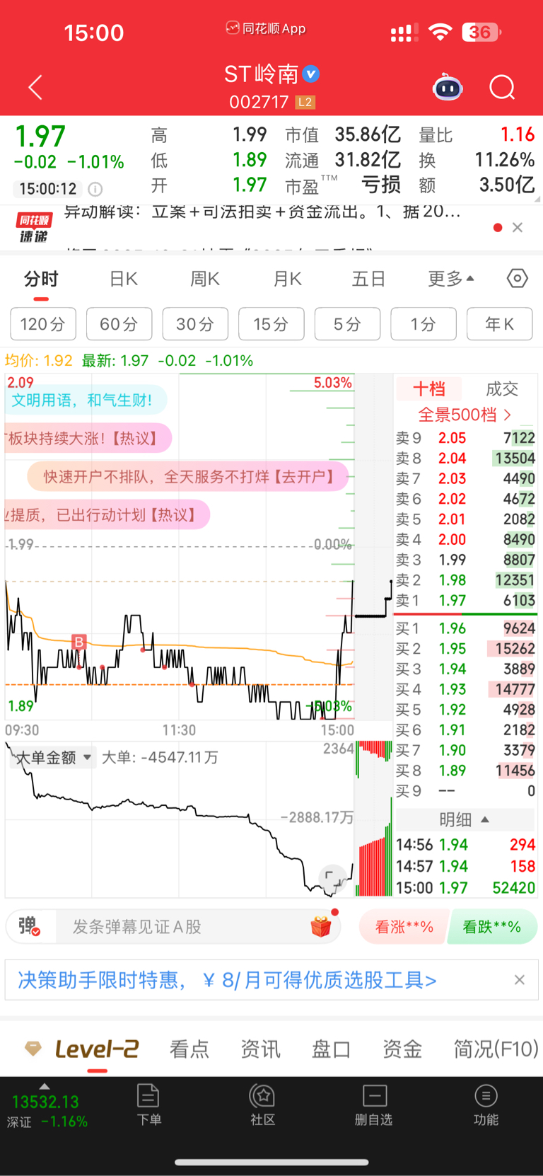 $ST岭南(SZ002717)$ 全程都再买,逢低疯狂的买,早盘卖了云动的钱,一股脑加进去了