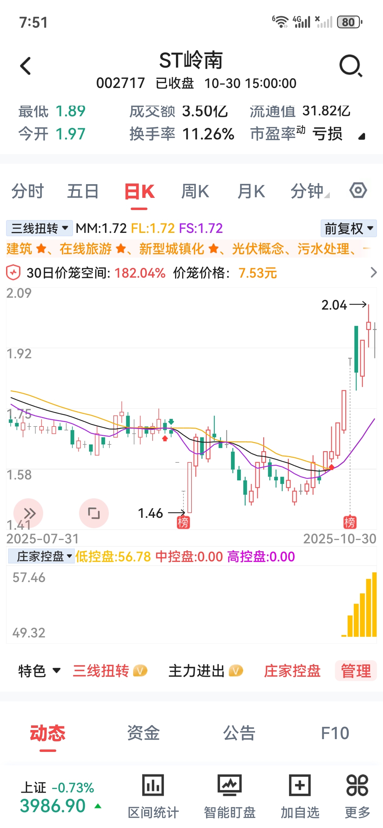 $ST岭南(SZ002717)$ 紫线上升趋势线良好,黄柱是主力资金及流入。所以,看图说话吧!