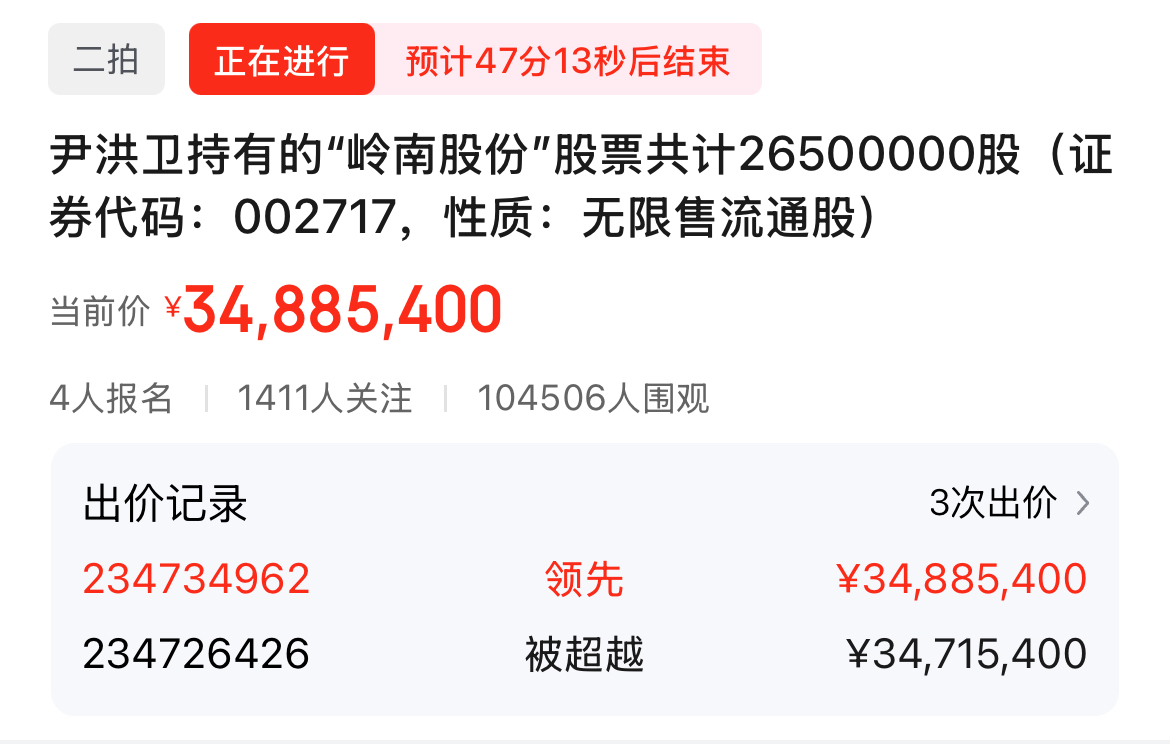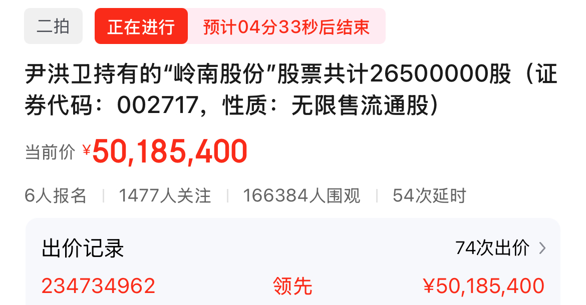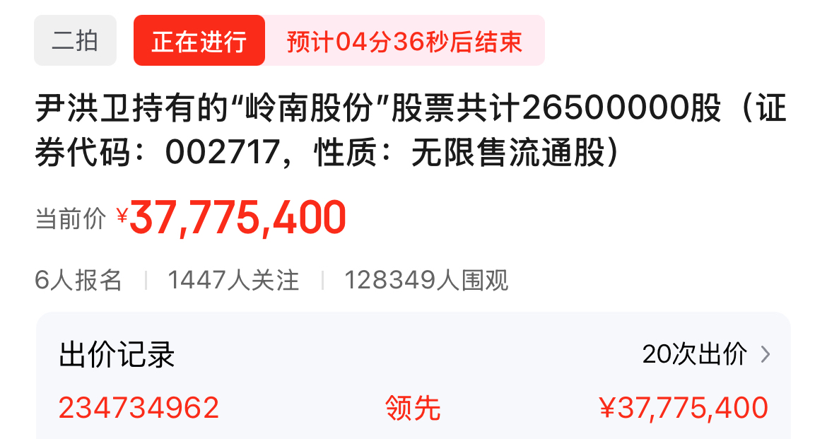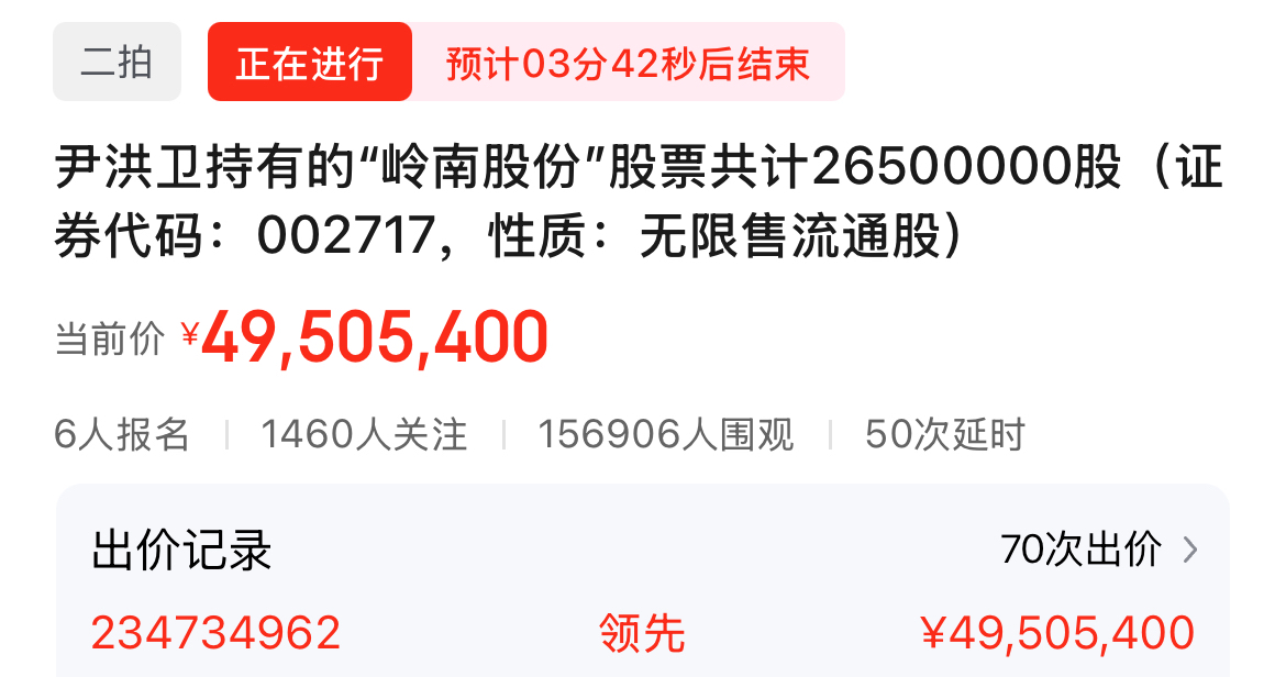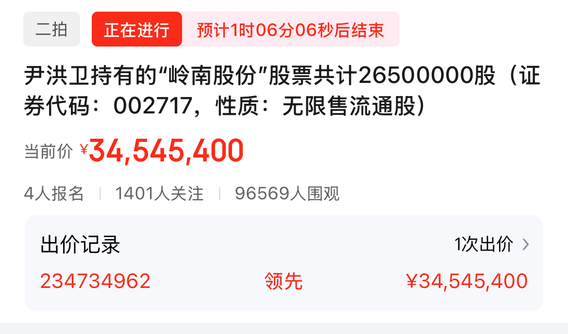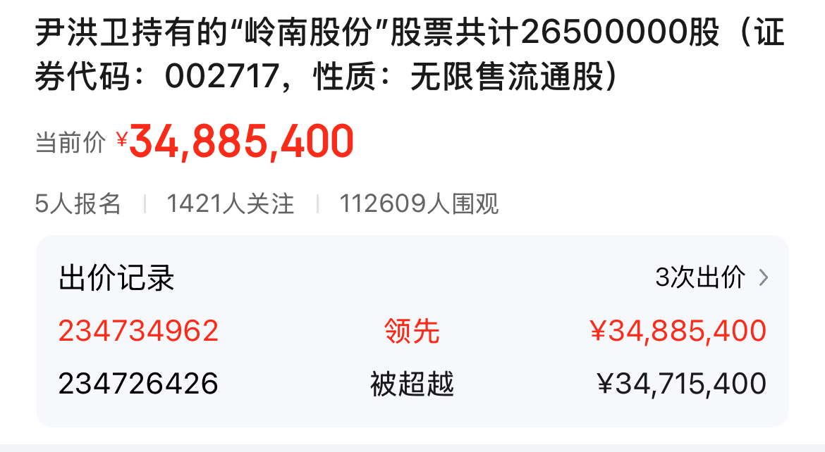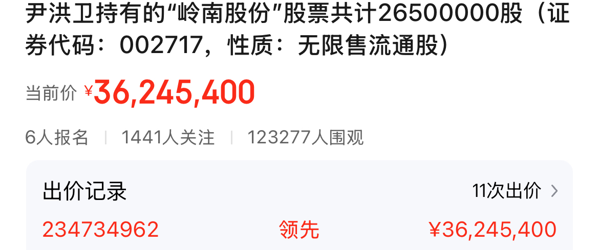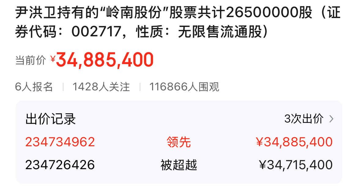 尹洪卫持有的“岭南股份”股票共计26500000股(证券代码:002717,性质:无限售流通股) 当前价:34,545,400