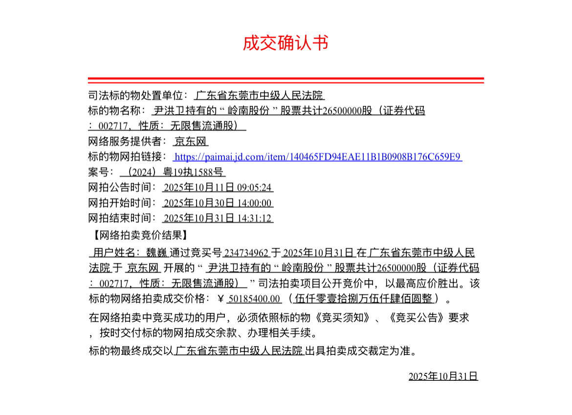 尹洪卫持有的“岭南股份”股票共计26500000股(证券代码:002717,性质