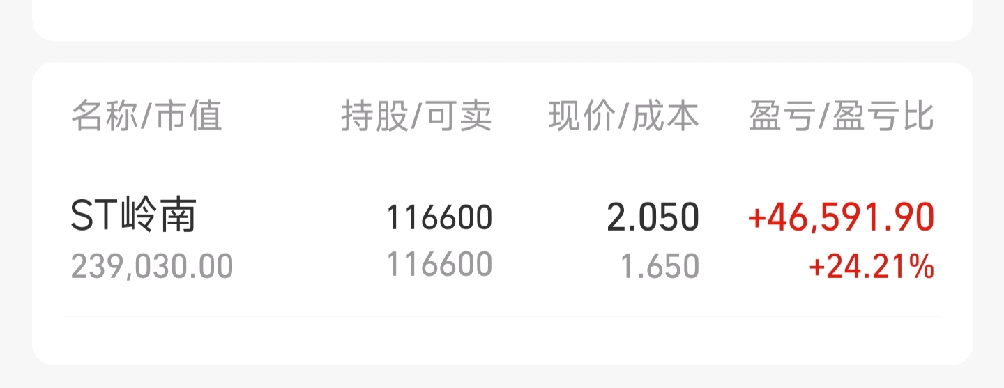 $ST岭南(SZ002717)$ 赚钱了哦,你们赚钱没?