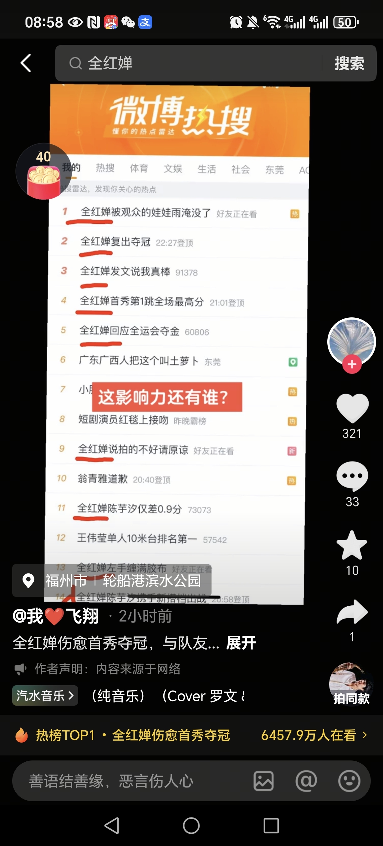 全红婵本届十五运第一枚金牌,王者归来,引发第一波赛事高潮,抖音热搜今天又是第一名