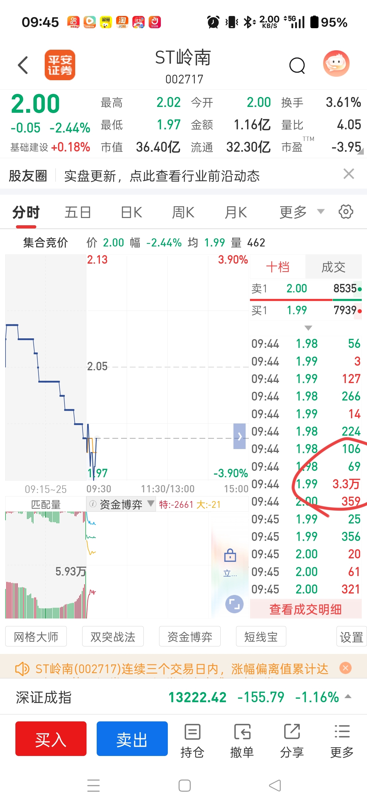 $ST岭南(SZ002717)$ 主力好阴,反手吃了3.3w手