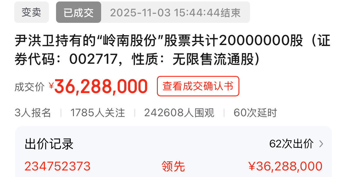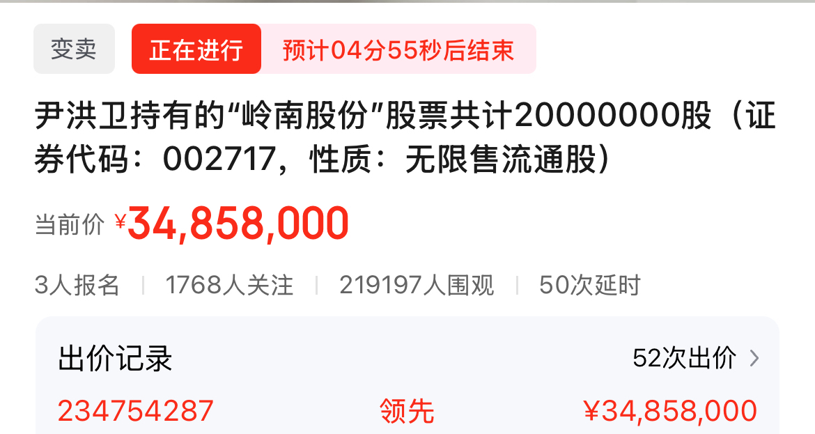 $ST岭南(SZ002717)$ $*ST正平(SH603843)$ $ST中迪(SZ000609)$ 尹洪卫持有的“岭南股份”股票共计20000000股(证券代码:002717,性质:变卖无限售流通股) ,报名人数:3人