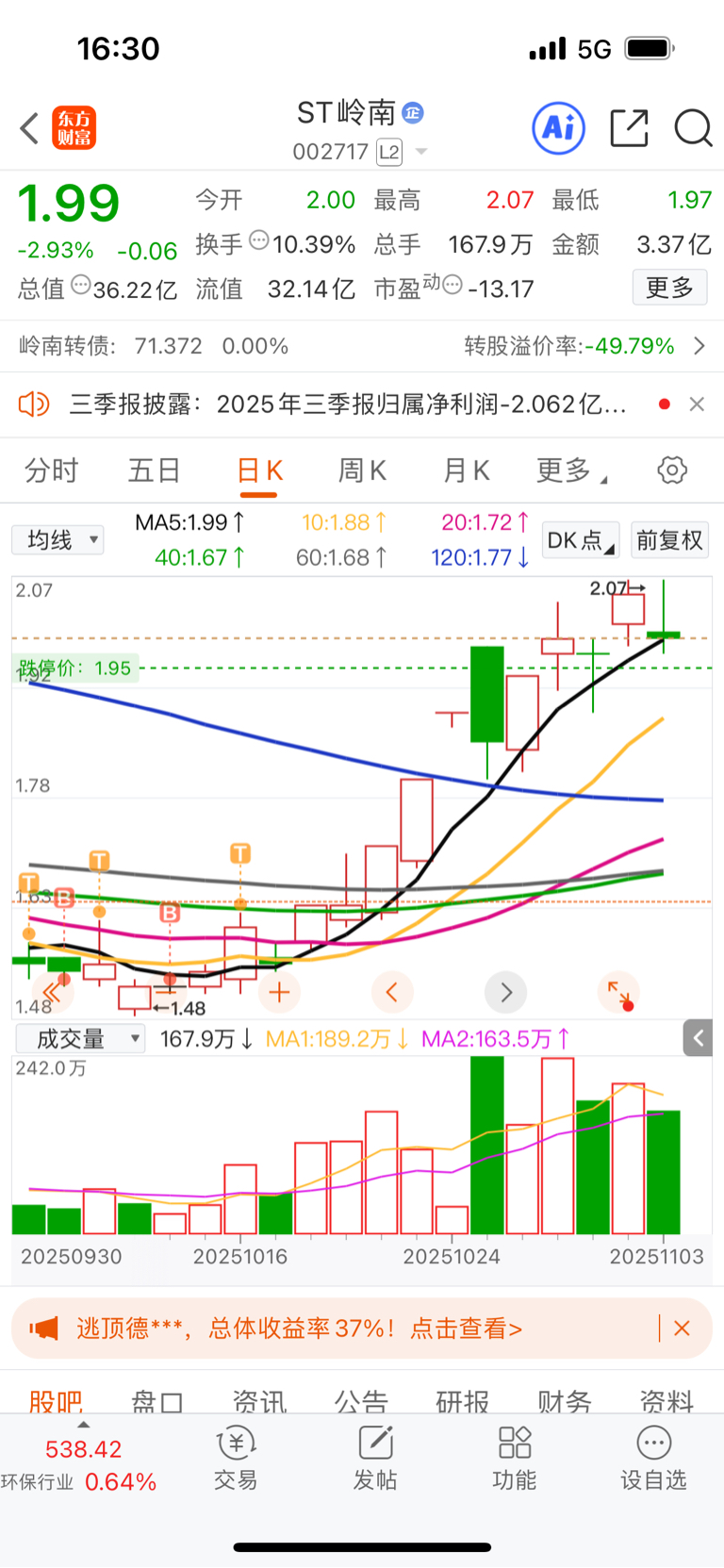 $ST岭南(SZ002717)$ 其实反过来想 今天竞拍结束 属于利好落地 预判短期已有回踩需求#收盘点评# 本人吹牛大胆预测预计会在1.85-1.9附近 随后开始冲3之路