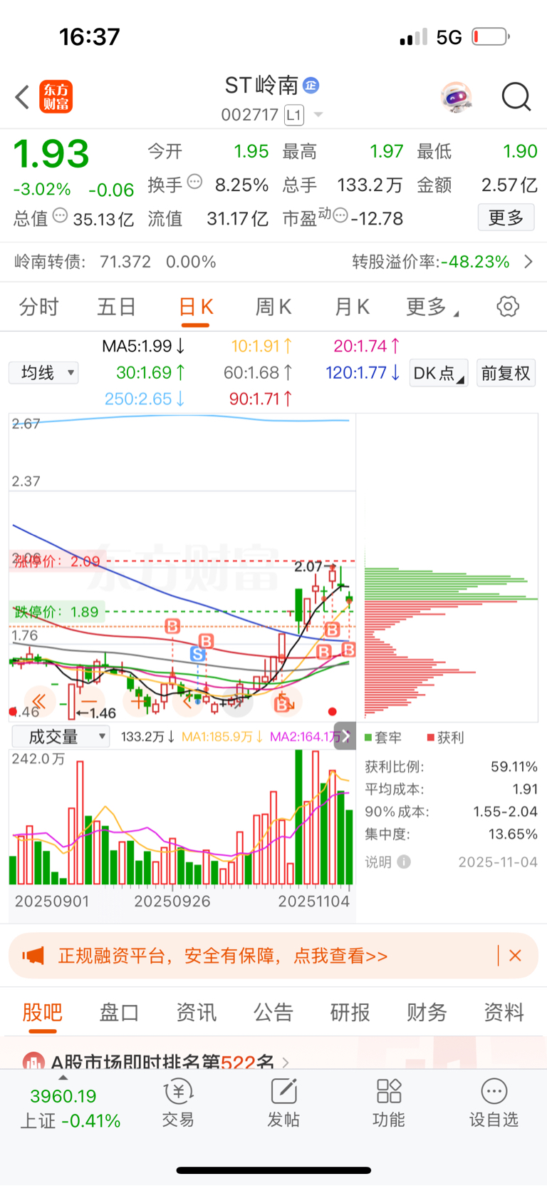 $ST岭南(SZ002717)$ 完美诠释了什么叫高位加仓一把输光、2.07打板加仓,明天再跌就到成本线了