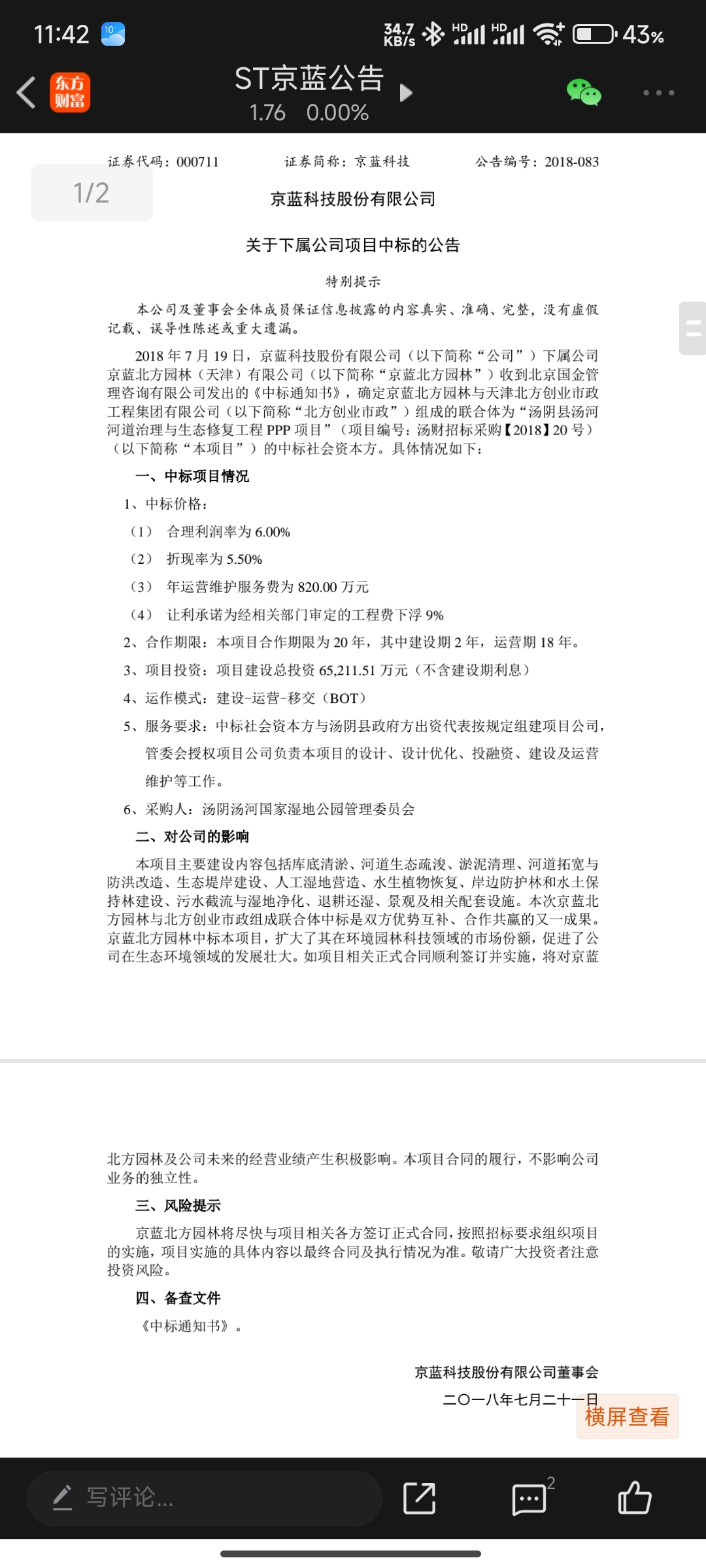$ST岭南(SZ002717)$ 2018年汤阴PPP工程实际中标公司京蓝科技。