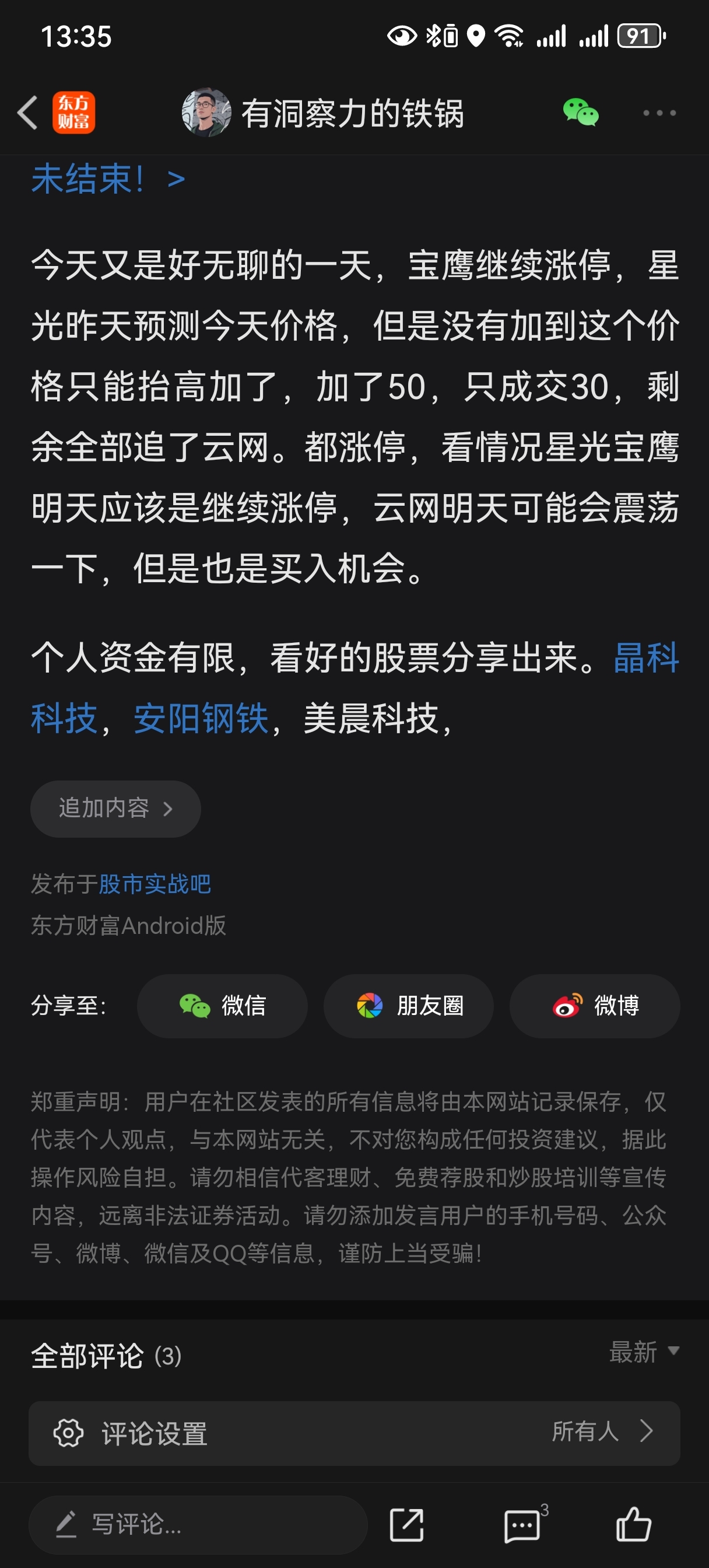温馨提示: 1.根据《证券法》规定,禁止编造、传播虚假信息或者误导性信息,扰乱证券市场;2.用户在本社区发表的所有资料、言论等仅代表个人观点,与本网站立场无关,不对您构成任何投资建议。用户应基于自己的独立判断,自行决定证券投资并承担相应风险。《东方财富社区管理规定》