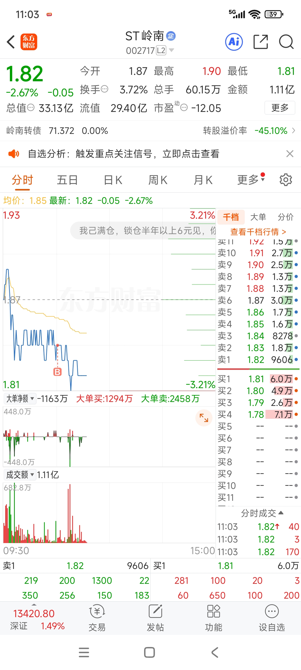 $ST岭南(SZ002717)$ 看看今天收1.85不,跟10.27那天一样,不要在意别人的看法,看好补就行了
