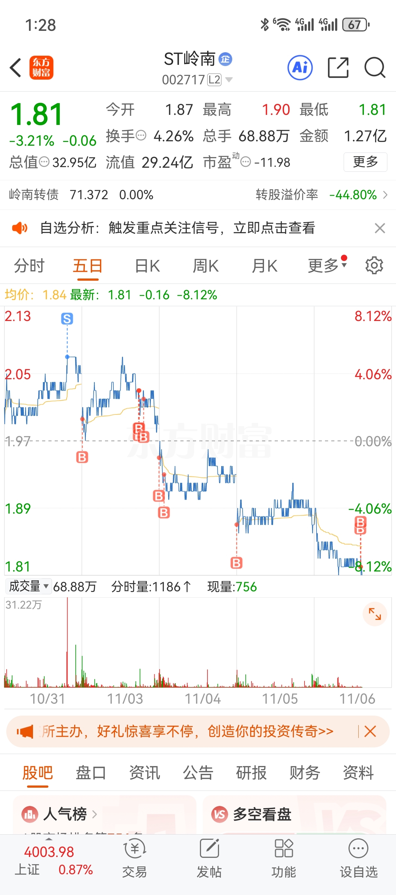 $ST岭南(SZ002717)$ 越跌越买,不要怂,今天再买点!