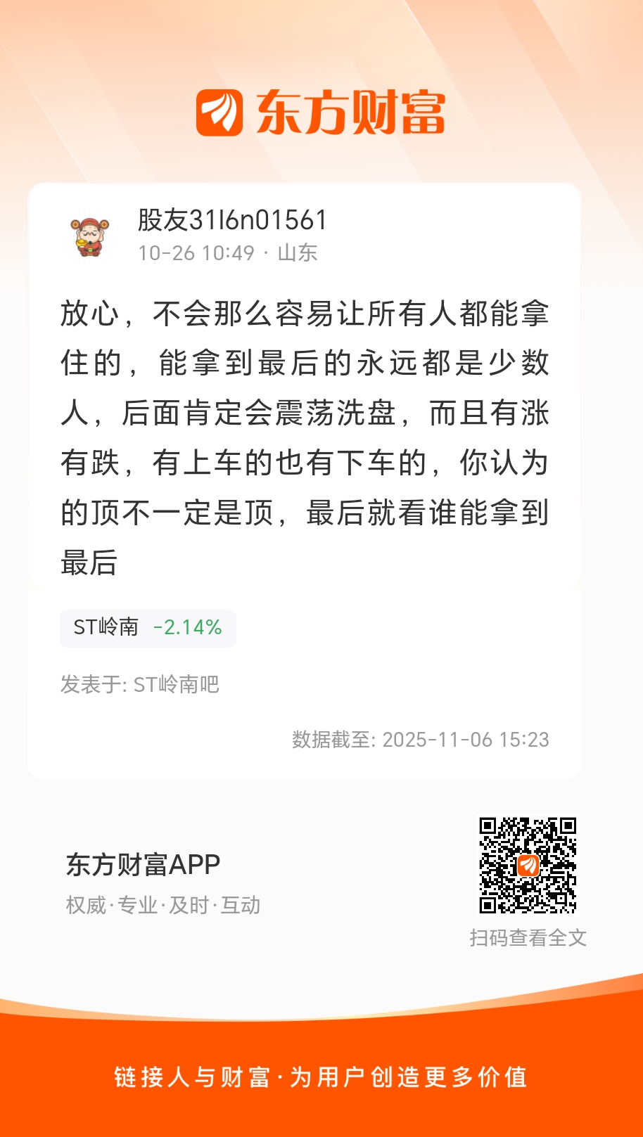 放心,不会那么容易让所有人都能拿住的,能拿到最后的永远都是少数人,后面肯定会震荡洗盘,而且有涨有跌,有上车的也有下车的,你认为的顶不一定是顶,最后就看谁能拿到最后