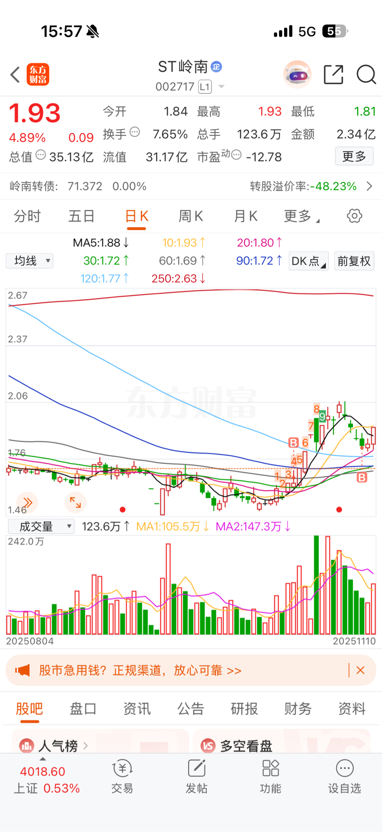 $ST岭南(SZ002717)$ 如果后面还有机会下探到1.8左右的话继续加仓,现在已经快2万股了,有机会再加1万股!