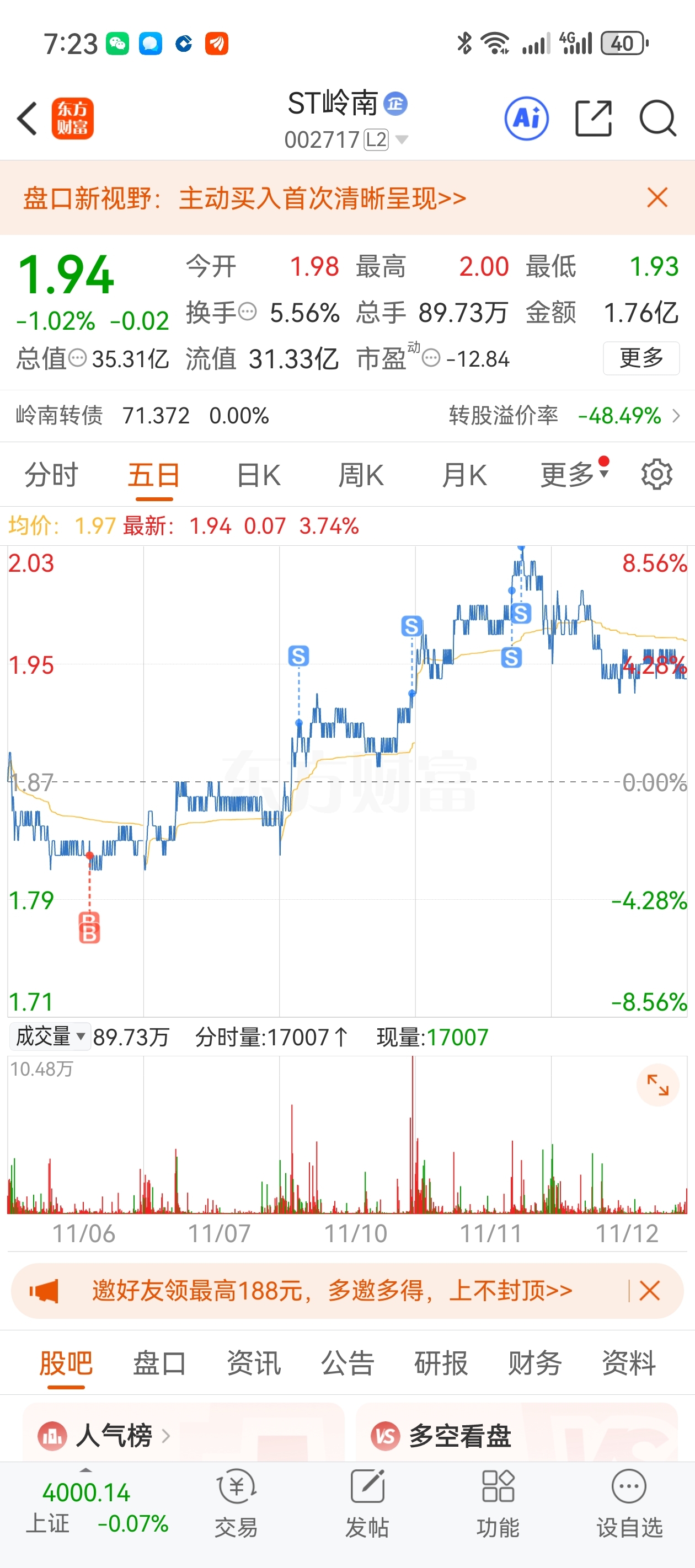 $ST岭南(SZ002717)$ 本周五能强势站稳2元以上,则月底前看到2.4!!反之若站不上2元,则月底前只能看到2.2了,就较弱了!!希望明天早盘向下调整一下,1.9在接点回来!!由于岭南股东数较多,每天交易活跃,在没特别利好消息的情况下,很难一直连涨,还好岭南后面的预期比较多,趋势是向上的,滚动做吧!