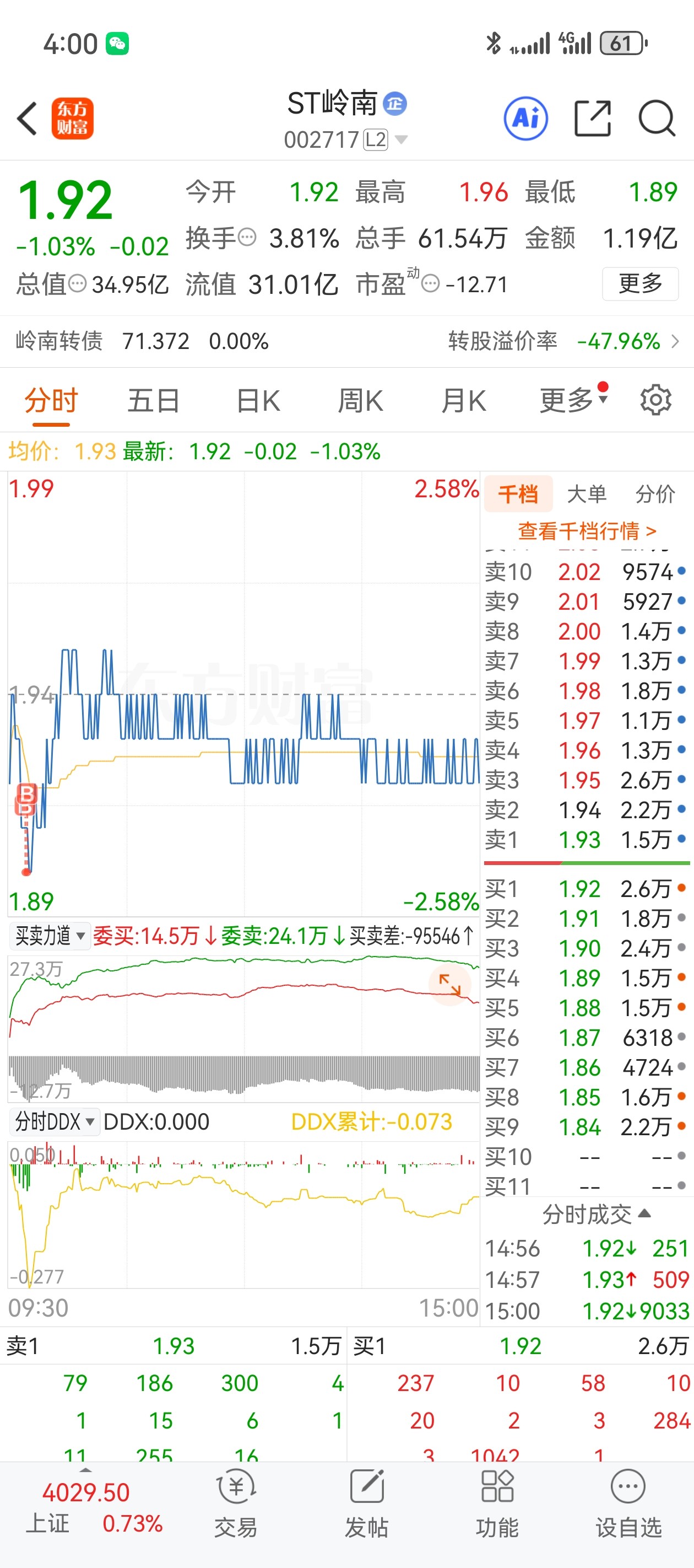 $ST岭南(SZ002717)$ 1.9已接到,今天缩量调整,最低点到1.89,个人认为调整到位!