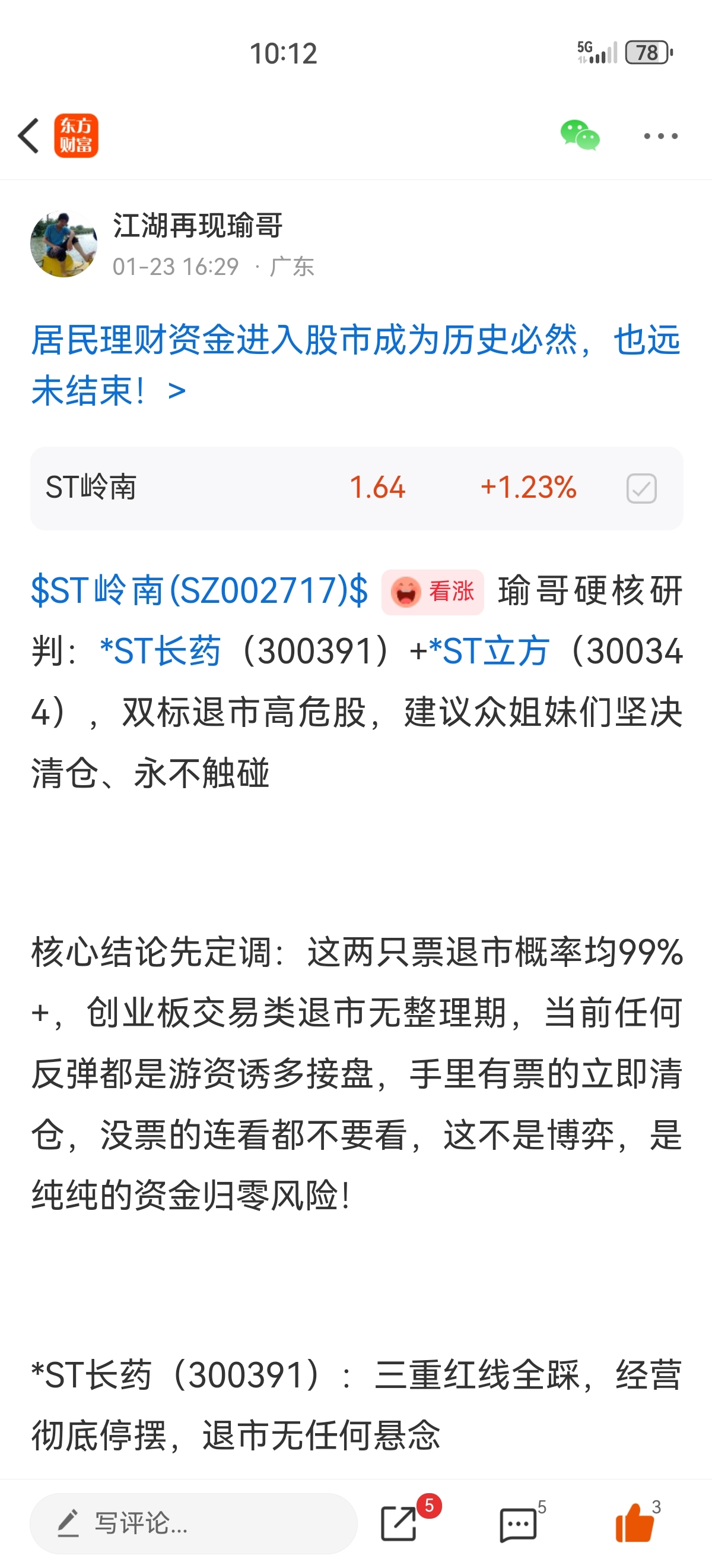 $ST岭南(SZ002717)$ 瑜哥昨天发帖建议大家别碰长药和立方,结果晚上长药就出退市公告了,立方也会退的不建议买,瑜哥最看好岭南退市,关注好伟大的瑜哥