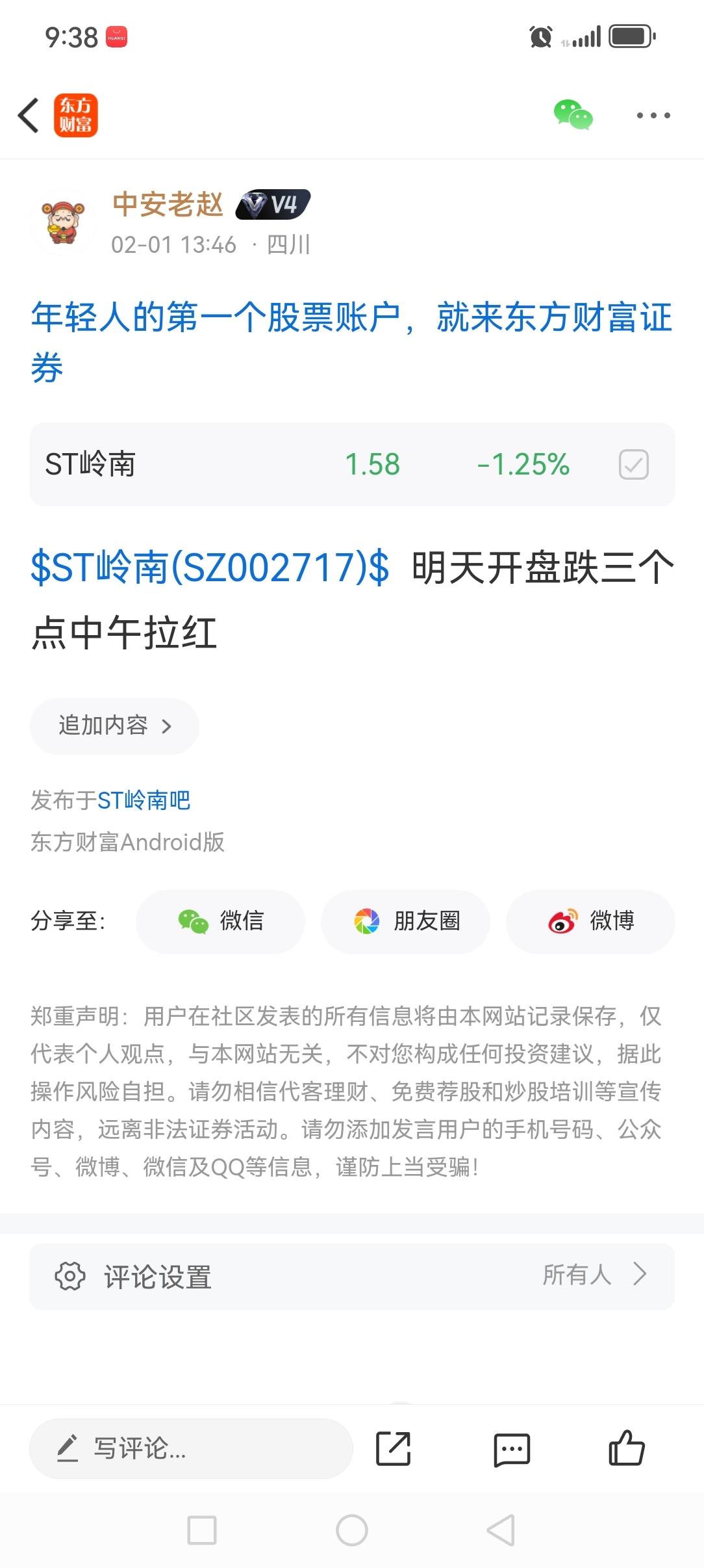 温馨提示: 1.根据《证券法》规定,禁止编造、传播虚假信息或者误导性信息,扰乱证券市场;2.用户在本社区发表的所有资料、言论等仅代表个人观点,与本网站立场无关,不对您构成任何投资建议。用户应基于自己的独立判断,自行决定证券投资并承担相应风险。《东方财富社区管理规定》