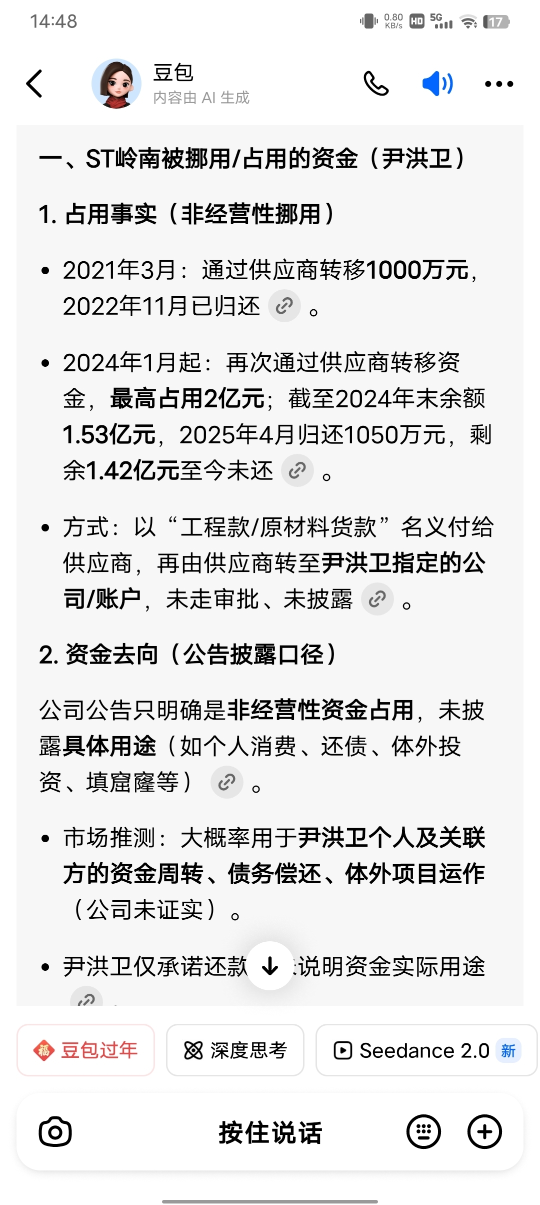 尹洪卫私自转移资金,未说明资金用途。目前为止,还有1.4亿,