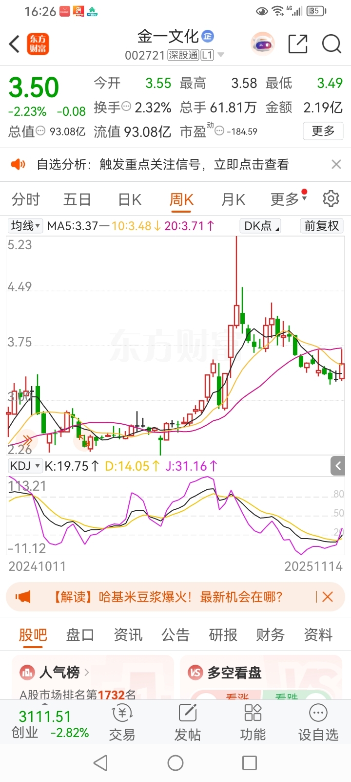 金一文化年底前是否上涨?下面是金一文化的日K线和周K线图,日K线遇60日线后回踩