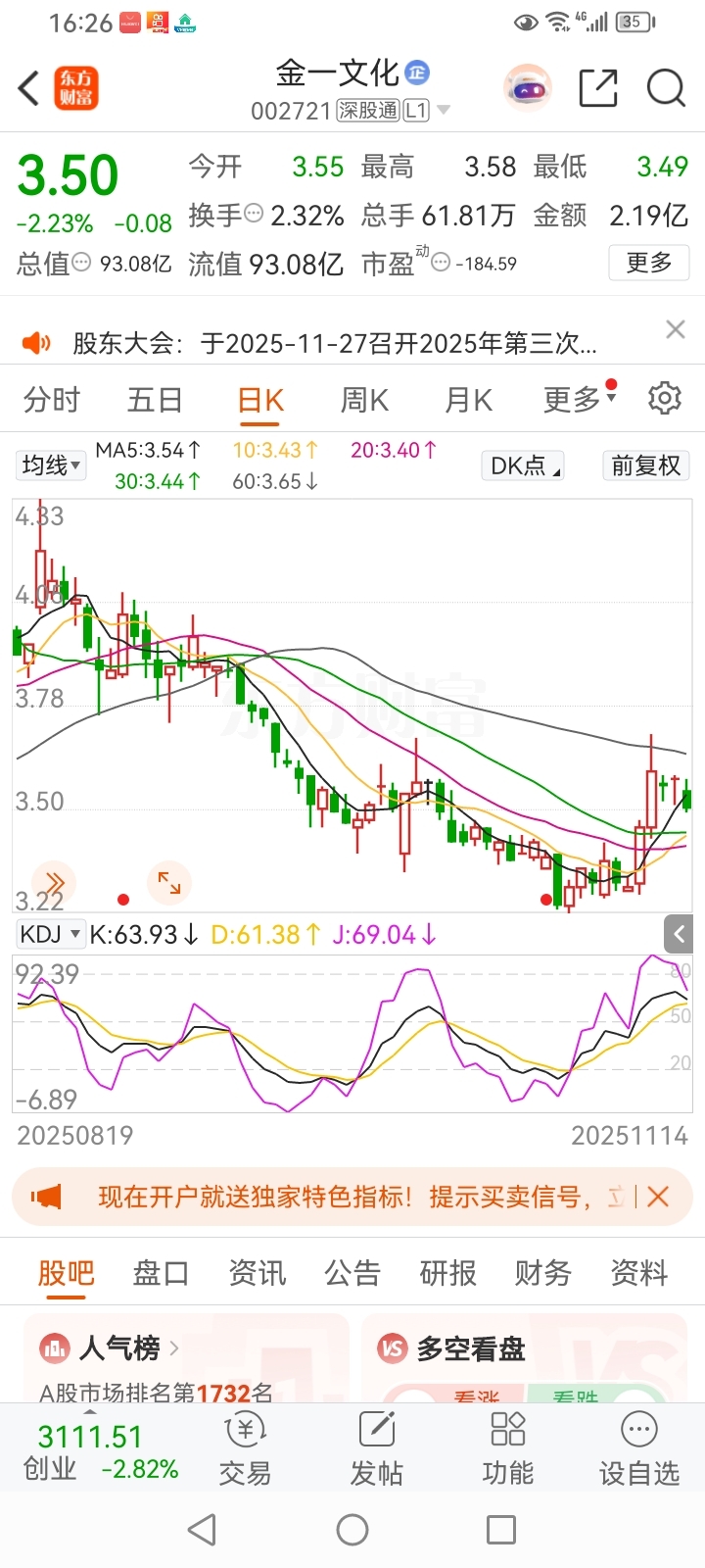 主力资金在本周一、二高调进场,随后三个交易日缩量回踩。下周初,金一文化大概率重拾升势!
