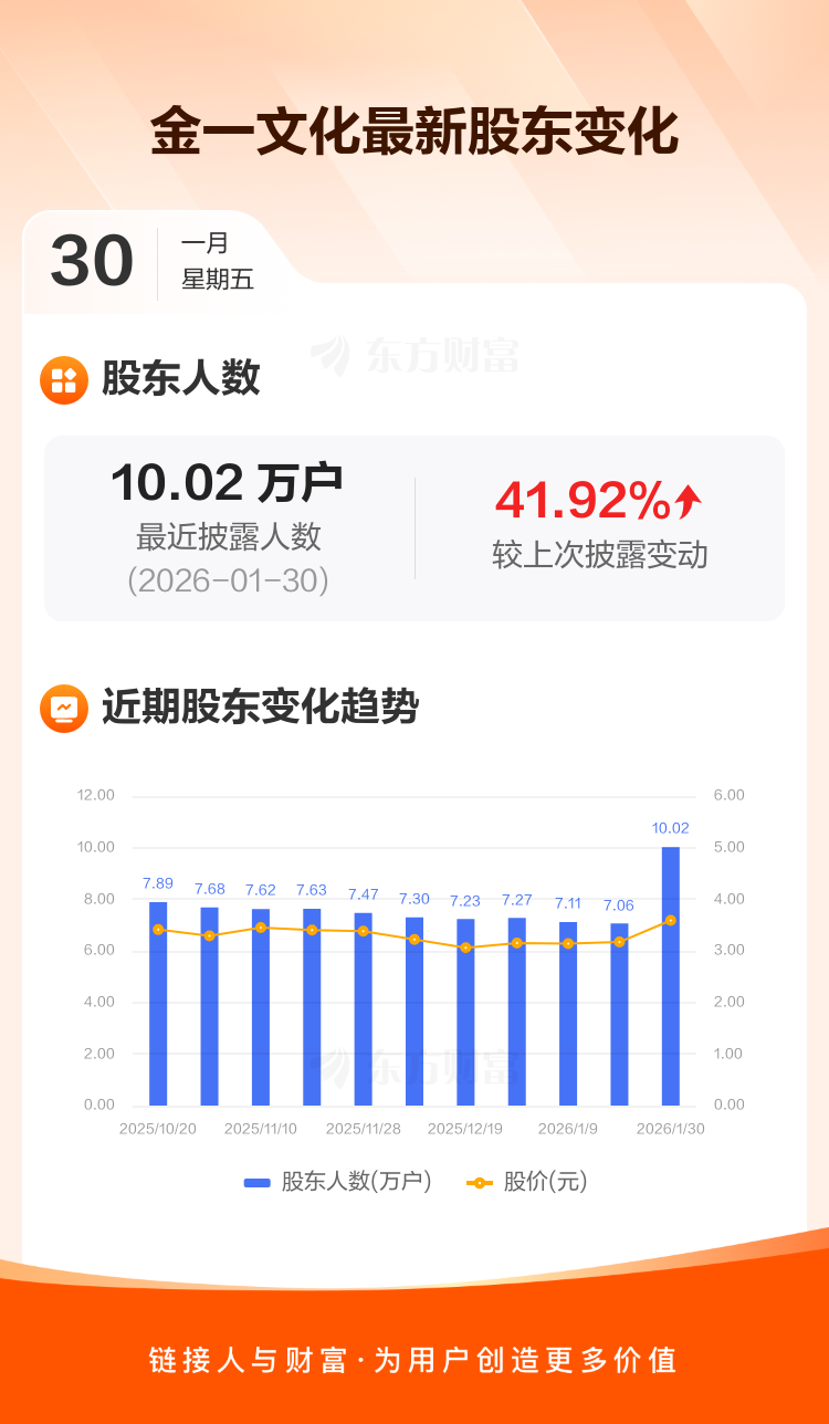 金一文化:截至1月30日最新股东户数10.02万户,较上期增加41.92%