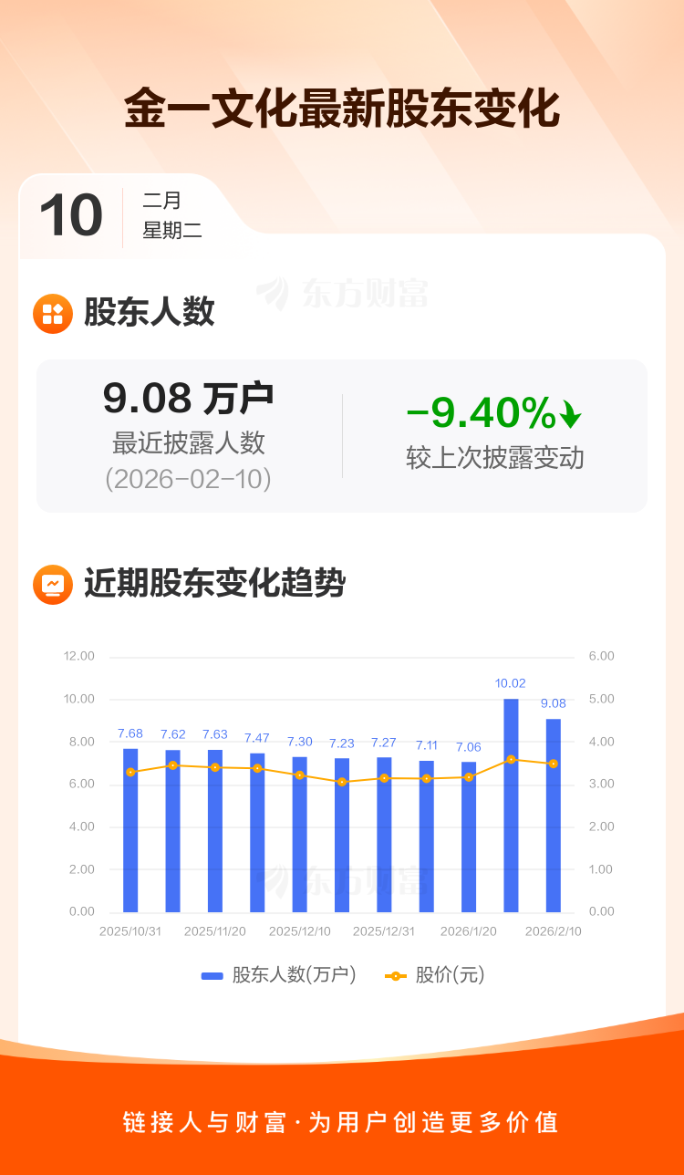 金一文化:截至2月10日最新股东户数9.08万户,较上期减少9.40%