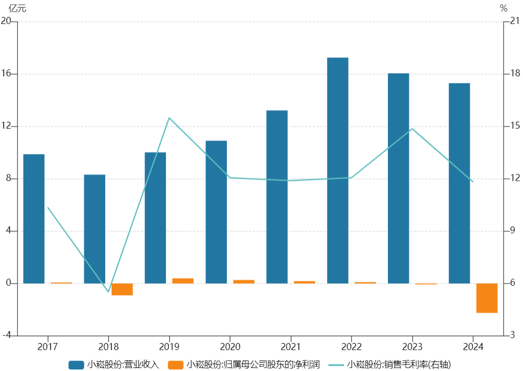 2023年至今年前三季度,小崧股份实现营业收入分别为16.04亿元、15.29亿元、7.64亿元,分别同比下滑6.97%、4.70%、35.61%;净利亏损691.64万元、2.45亿元、7110.58万元。