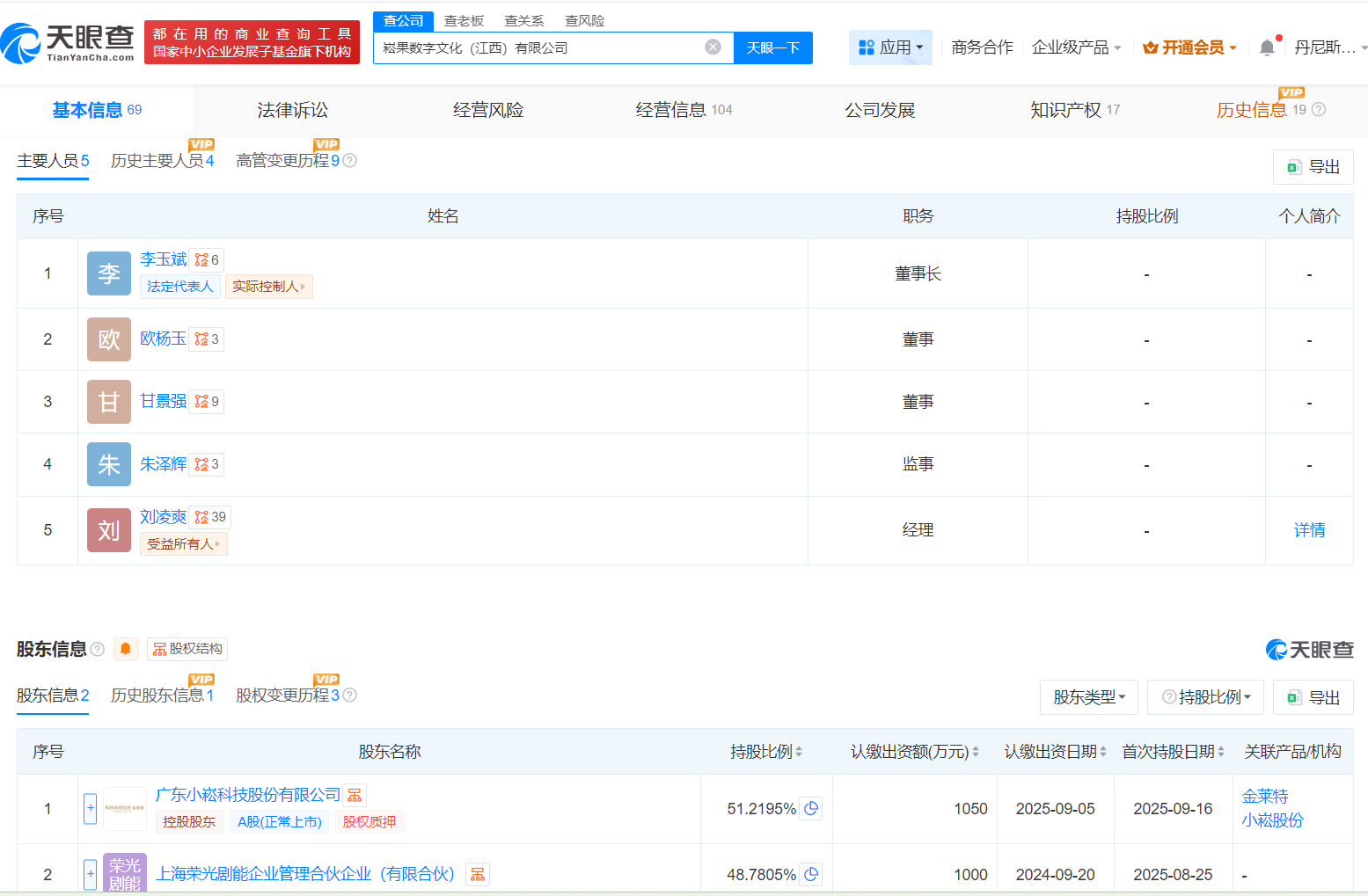 崧果数字文化(江西)有限公司曾用名为华阳数字文化 (江西) 有限公司(以下简称“华阳数字”),由华阳国际(002949.SZ)出资1000万元于2024年成立,实际控制人为李玉斌,刘凌爽在公司任经理一职。公司主营包括数字内容制作服务等。今年8月25日,华阳数字更名为崧果数字。9月20日,华阳国际退出,小崧股份和上海荣光剧能分别出资1050万元、1000万元,持股51.22%、48.78%。