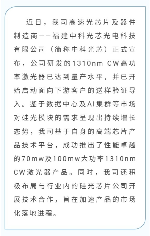 跃岭股份:高端光芯片核心标的中科光芯攻克技术难关推出性能优异CW大功率磷化铟激光