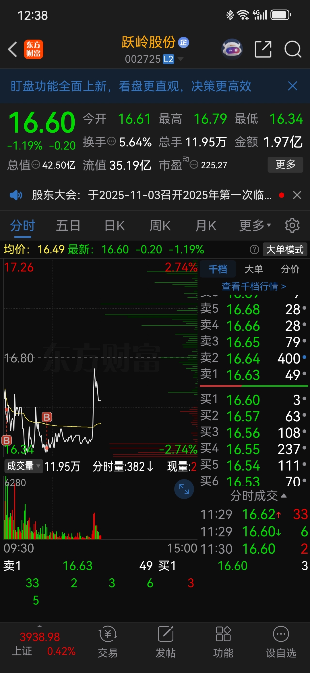 $跃岭股份(SZ002725)$ 不惧震荡,坚定持有!大家不要被主力振下车,短期内有拉升可能!主力资金已经控盘,涨跌随意,就看你有没有格局,能不能承受剧烈震荡,我是坚定看好,三季报后一波大行情!拭目以待吧