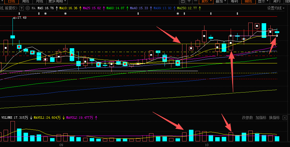 跃岭有倍量柱支撑,不能不说这里是买点。月线级别回踩5月线,稳健。总体是下不去了。所以日线9.26日涨停板低开高走,封死涨停,成交量倍量,非常强。收盘价格,黄色实线支撑。接着10.15日倍量柱,收盘紫色实线支撑。后续调整几天,缩量,站稳紫色实线。现在有紫色实线喝黄色实线支撑。此票可以冲刺了。