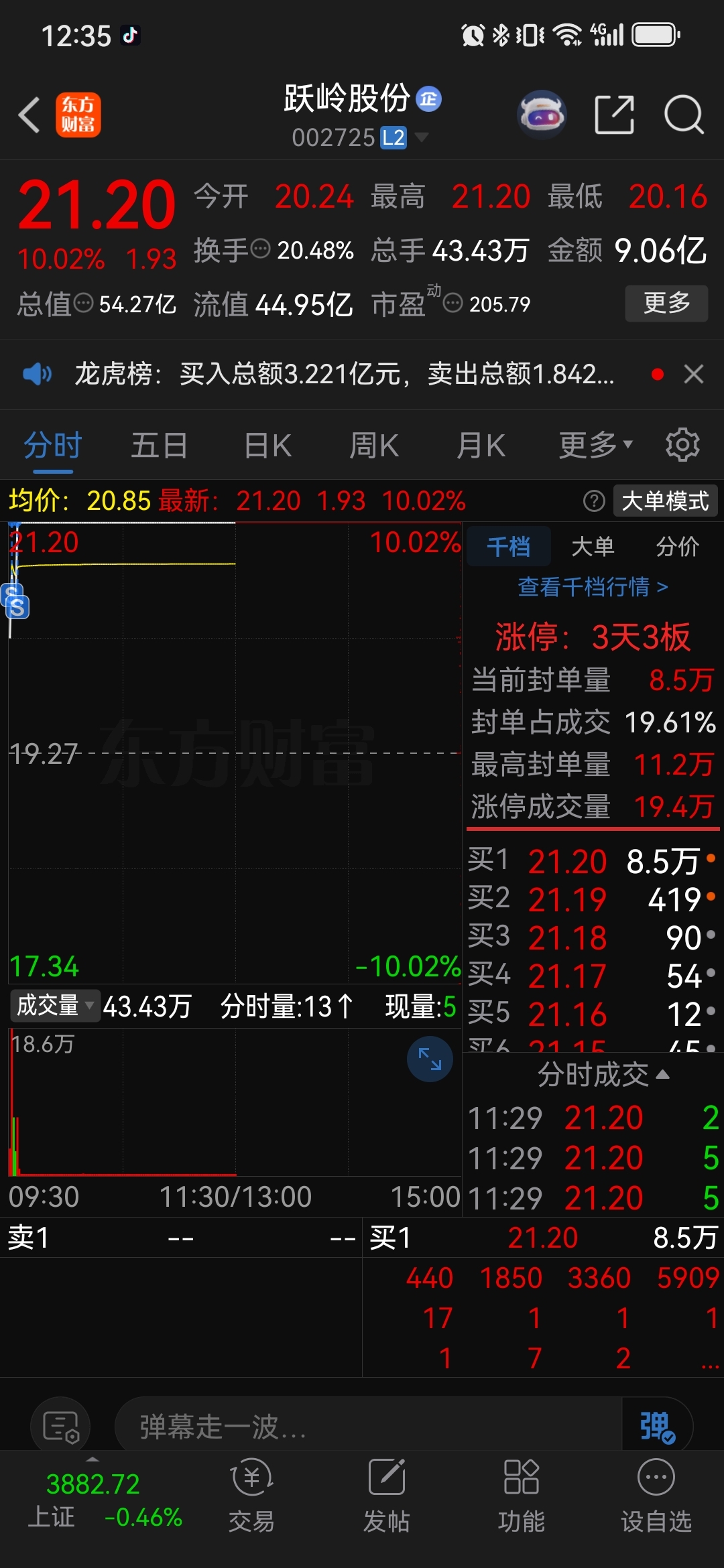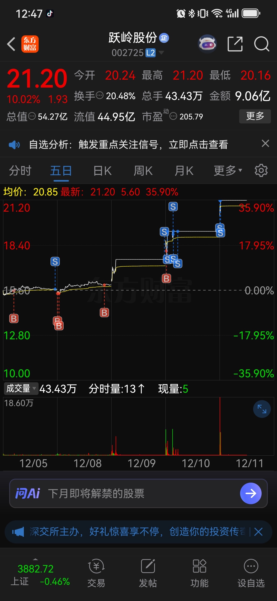 $跃岭股份(SZ002725)$ 今天全 出了,祝留下的股友们发财了