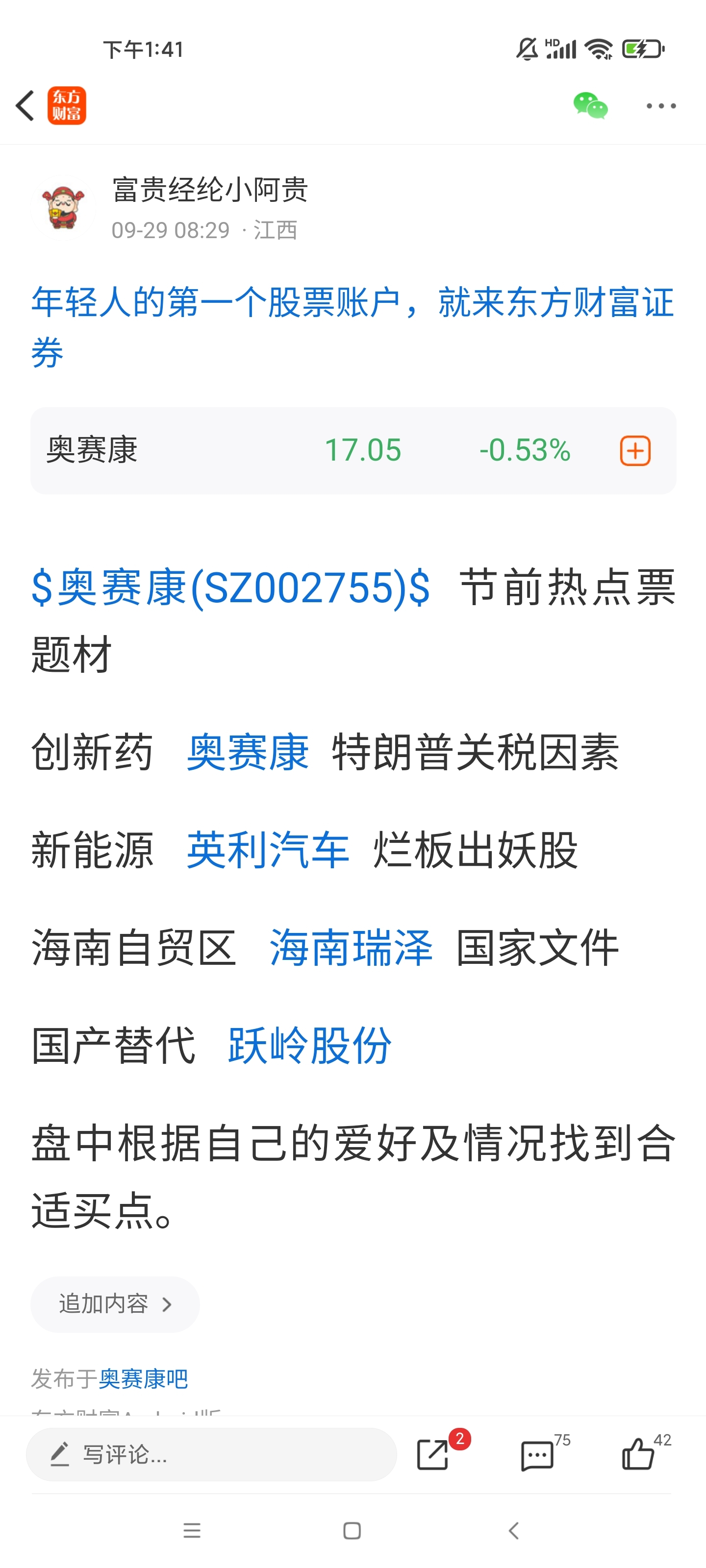 温馨提示: 1.根据《证券法》规定,禁止编造、传播虚假信息或者误导性信息,扰乱证券市场;2.用户在本社区发表的所有资料、言论等仅代表个人观点,与本网站立场无关,不对您构成任何投资建议。用户应基于自己的独立判断,自行决定证券投资并承担相应风险。《东方财富社区管理规定》