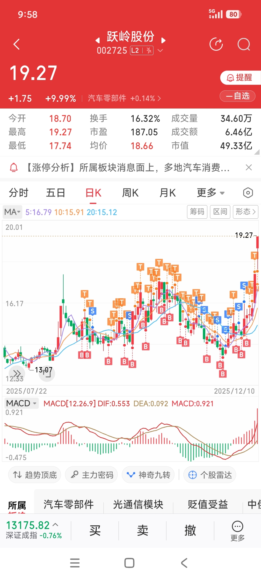 $跃岭股份(SZ002725)$ 守一只股票是很寂寞的,当看到人家大口吃肉,自己买的票却在喋喋不休,12月3日那天强烈预感是主力试盘,所以一直盯着这票,从17块跌下来,也是亏不少,现在获利了,感觉炒股太难了,进进出出,真不如看好一个好公司,持有一段时间,这样也不会太累。